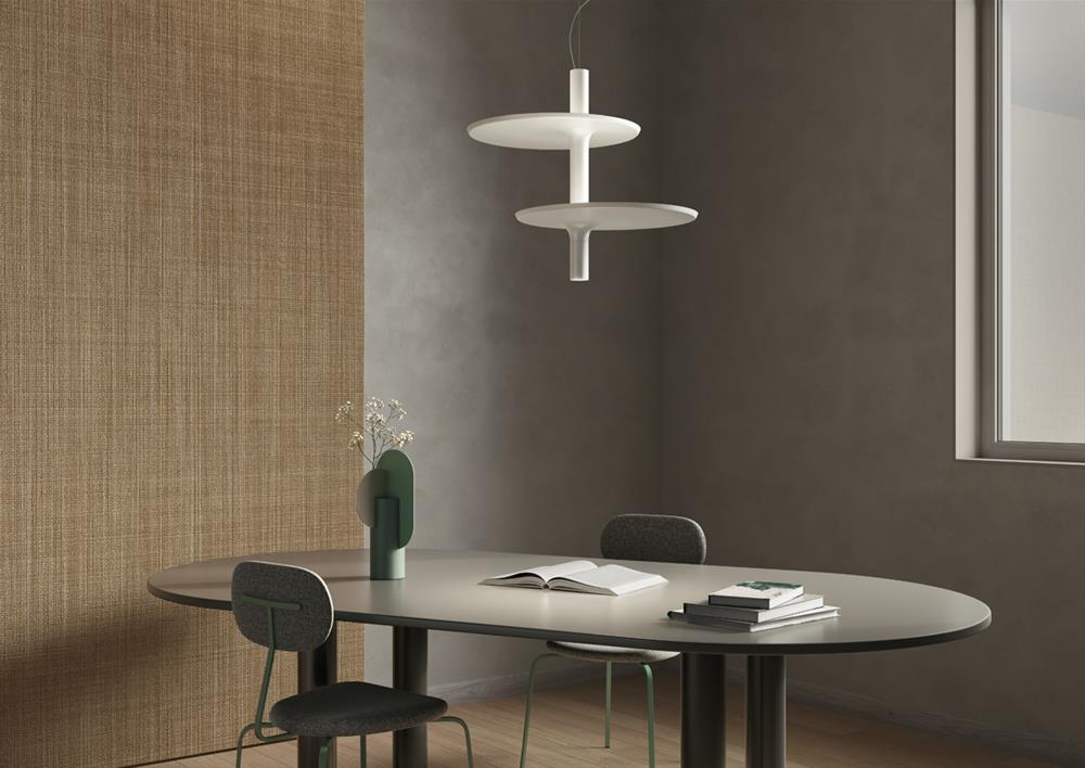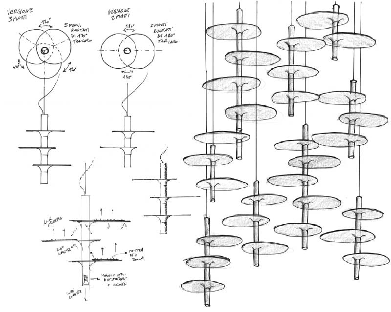 Závesné svietidlo s kovovým telom. Saténové metakrylátové difúzory. Dostupné v dvoch rôznych rozmeroch.