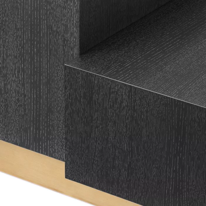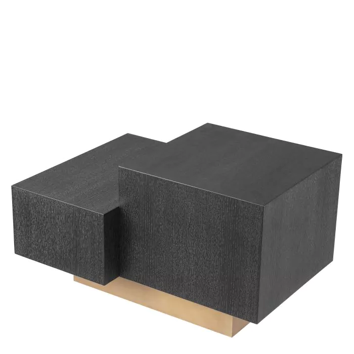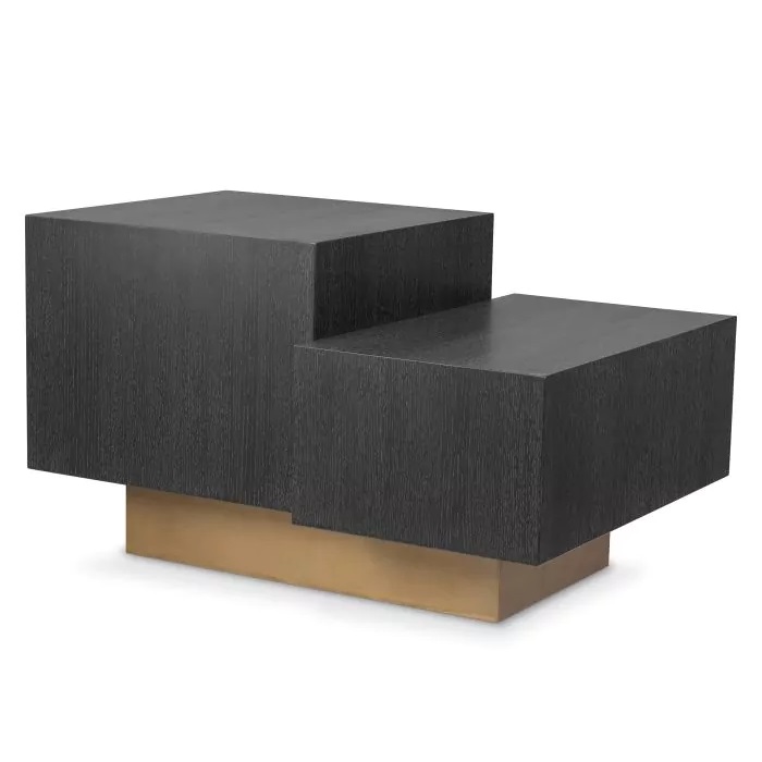 Príručný stolík Nerone s dubovou dýhou charcoal grey oak a základňou z vysokoleštenej ocele v brúsenom matnom mosadznom prevedení.