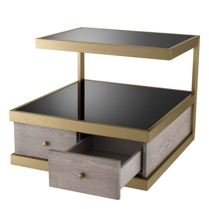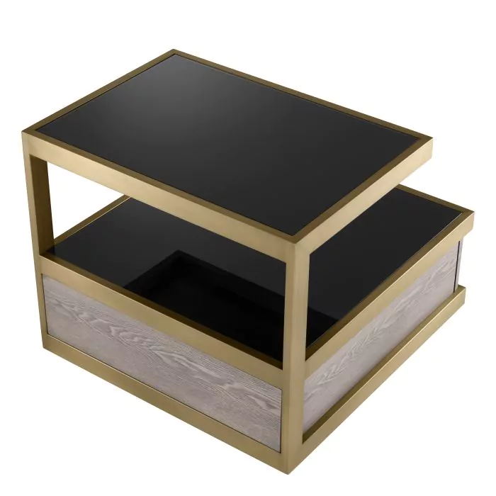 Povrchová úprava z brúsenej mosadze | sivá dubová dyha | čierne sklo
