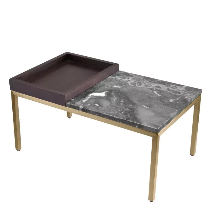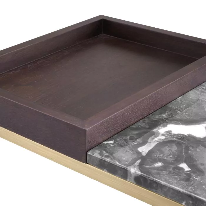 Povrchová úprava z brúsenej mosadze | sivý mramor | hnedá dubová dyha