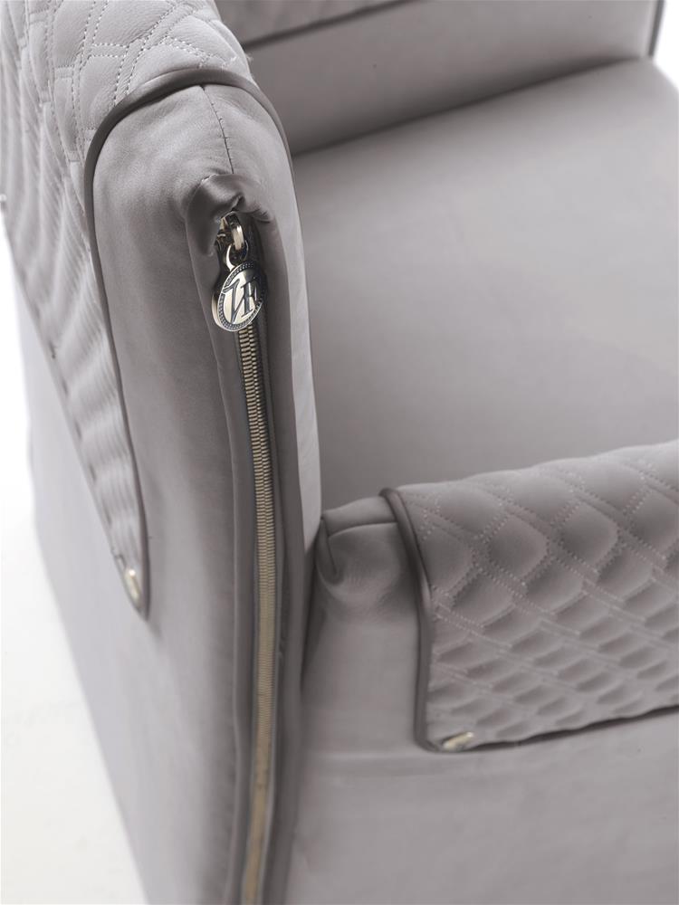 Podrúčky : vonkajšia a vnútorná časť podrúčok je vyrobená s prešívanou vložkou dizajn E s hladkým profilom a na želanie zdobená pántami a ozdobnými gombíkmi v zlatej farbe alebo čiernej chrómovej farbe.