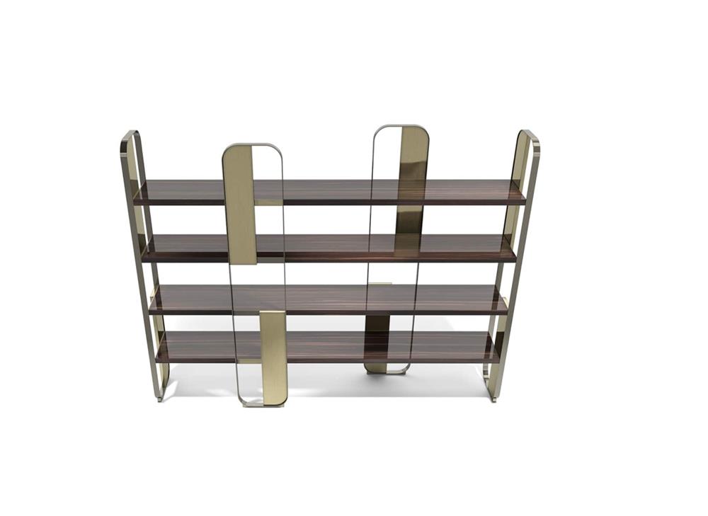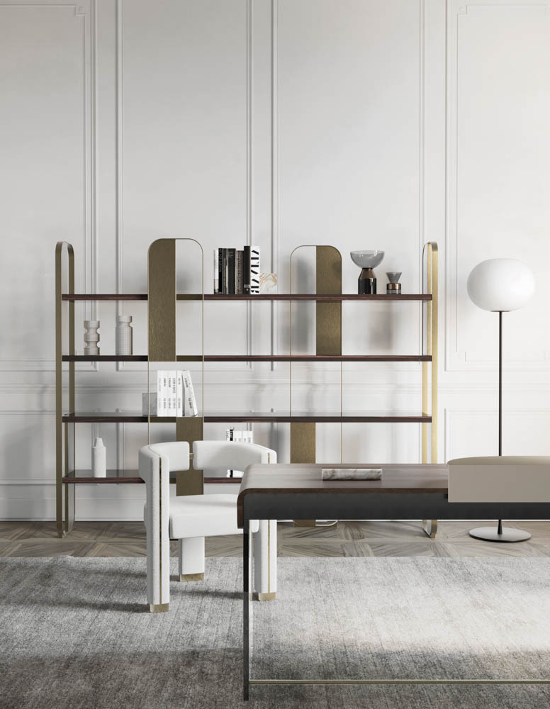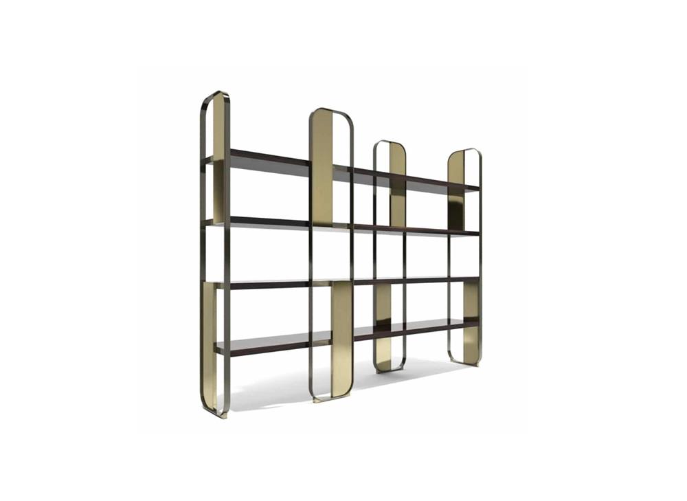 Modulárny systém spájajúci estetickú ľahkosť a remeselnú zručnosť. Kovová konštrukcia. Panely v kovovej povrchovej úprave. Drevené police.