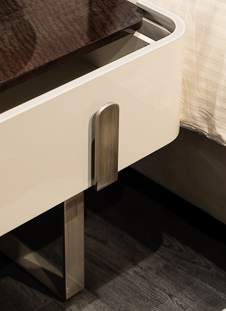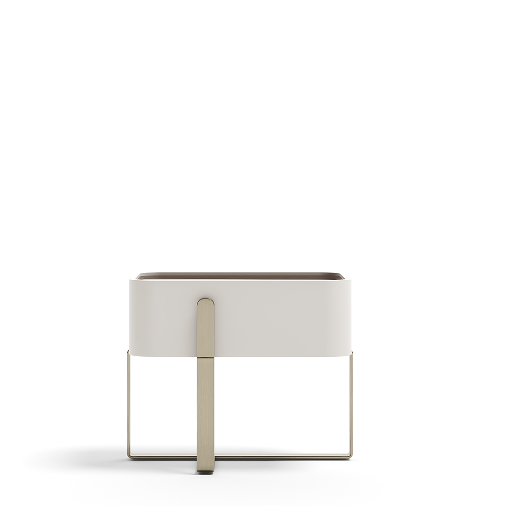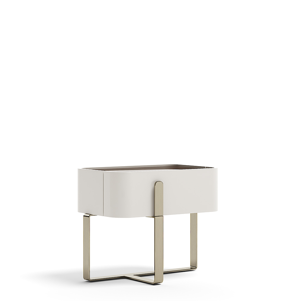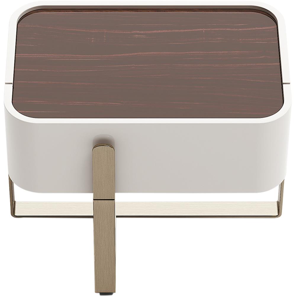 Béžovo hnedý lakovaný rám, kovová rukoväť s jednou zásuvkou, drevený vrch.