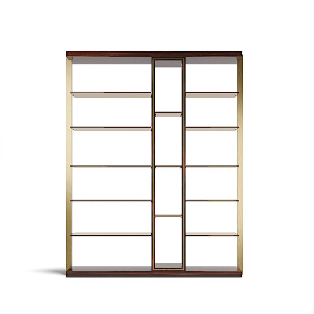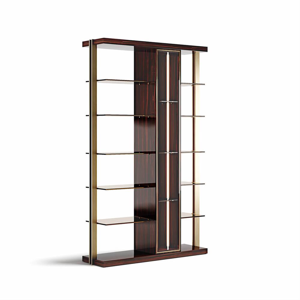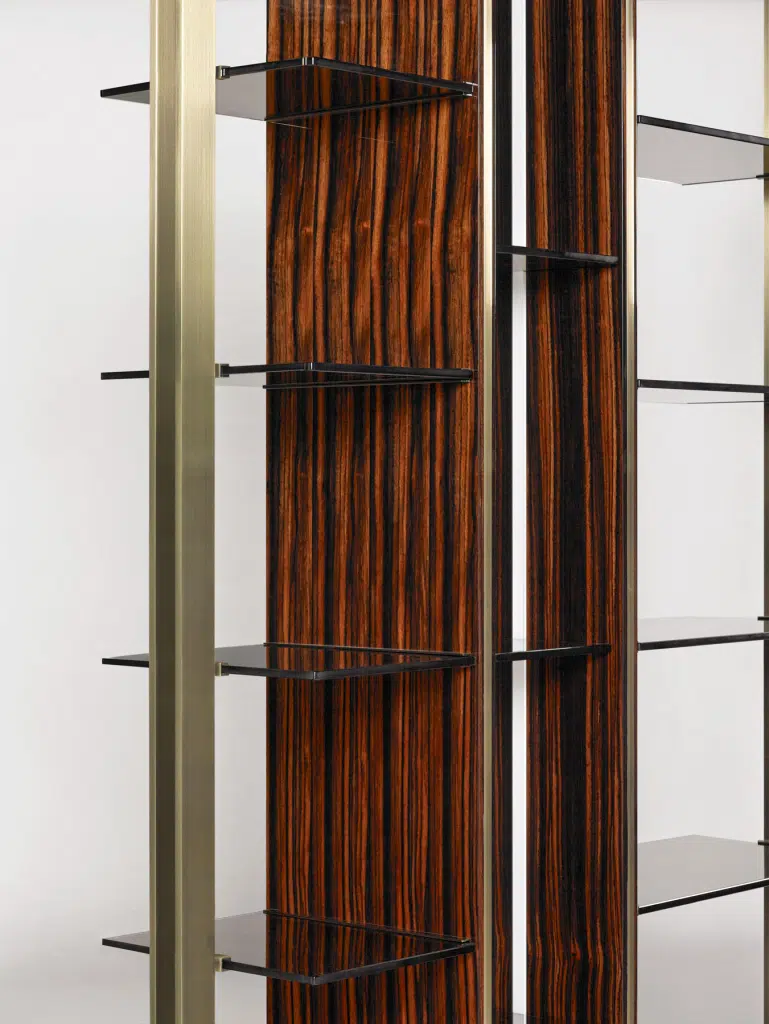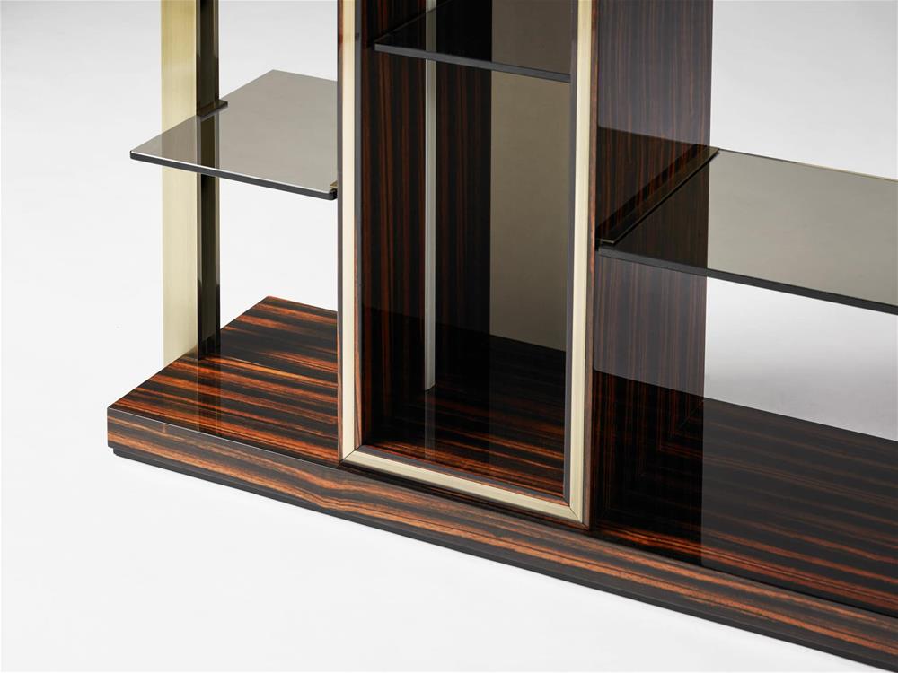 Drevená konštrukcia, sklenené police s bronzovým efektom, kovové detaily, vnútorné led osvetlenie.