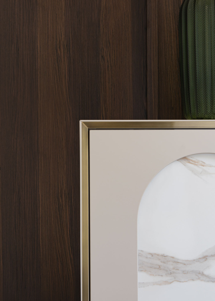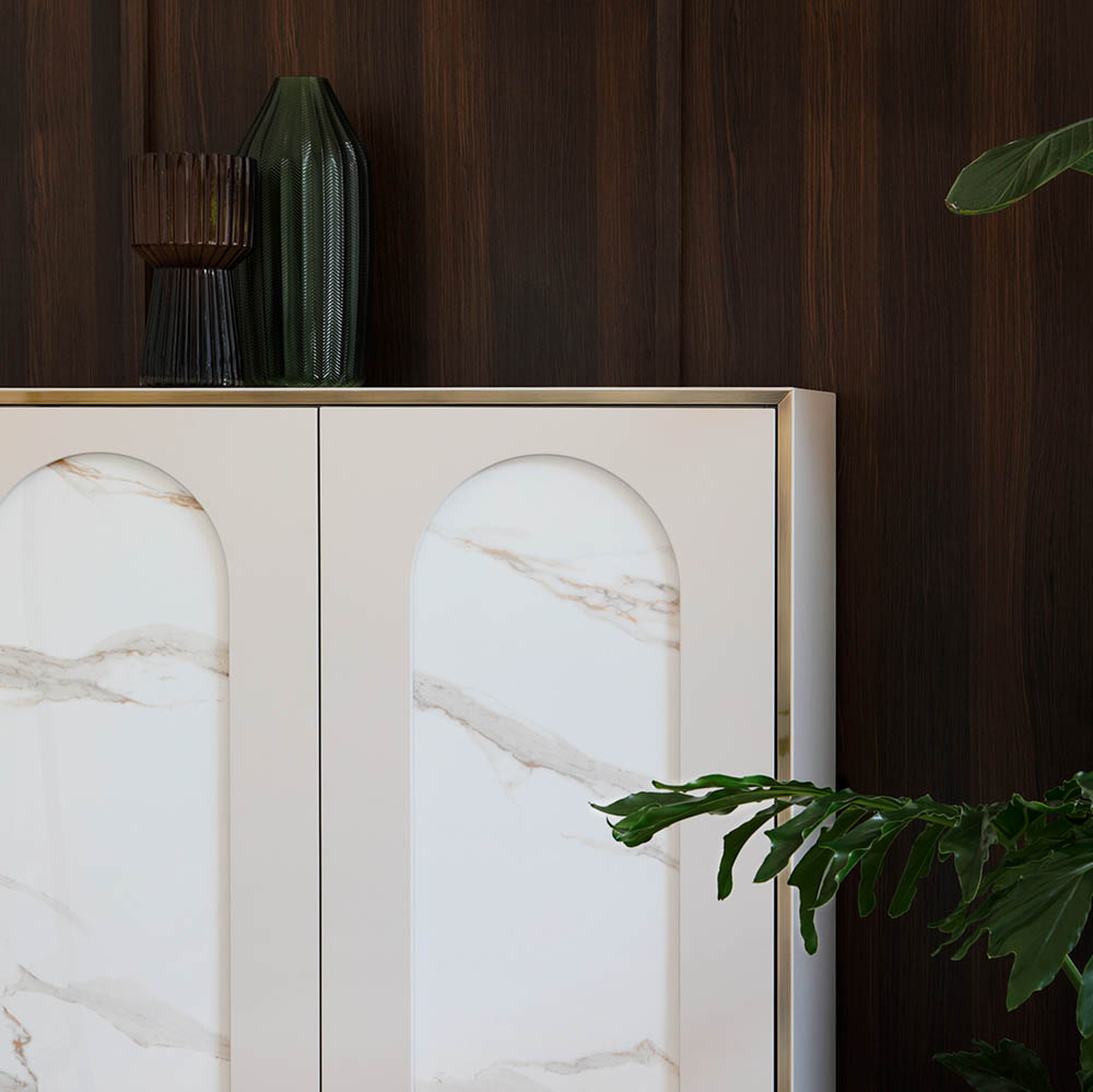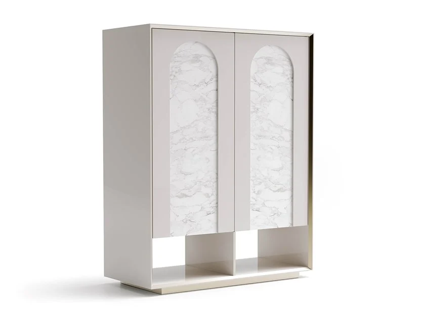 Základňa z kovovej úprave, kovové profily a detaily, lakovaná štruktúra, lakované oblúky, vnútorné police z tvrdeného skla. Voliteľné led podsvietenie.