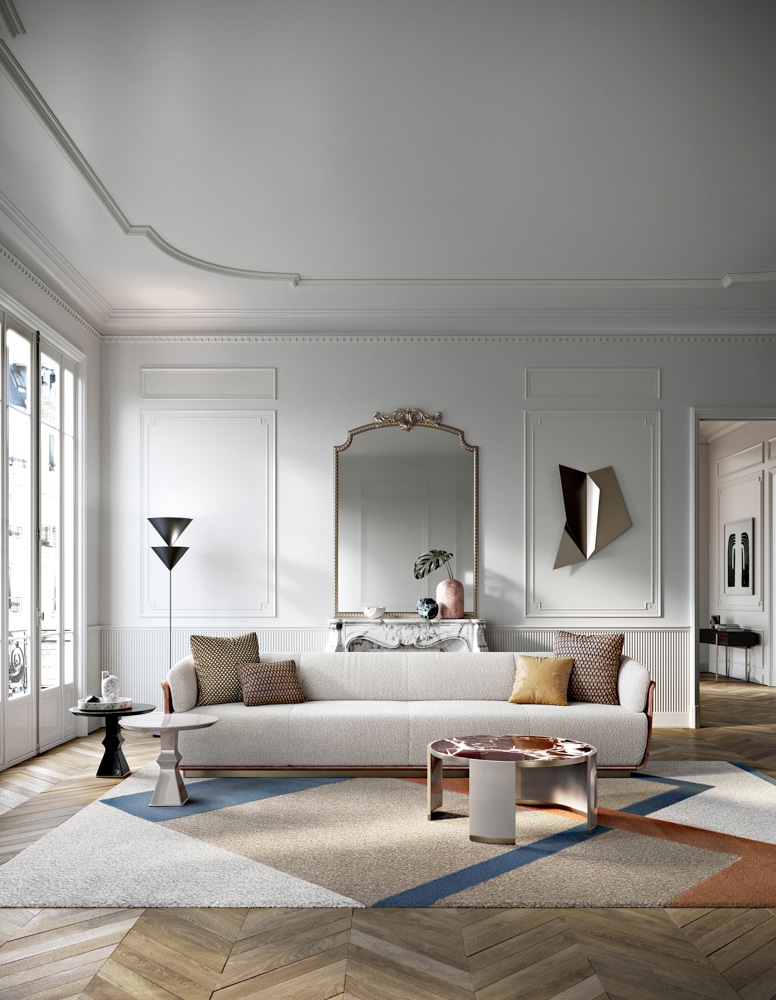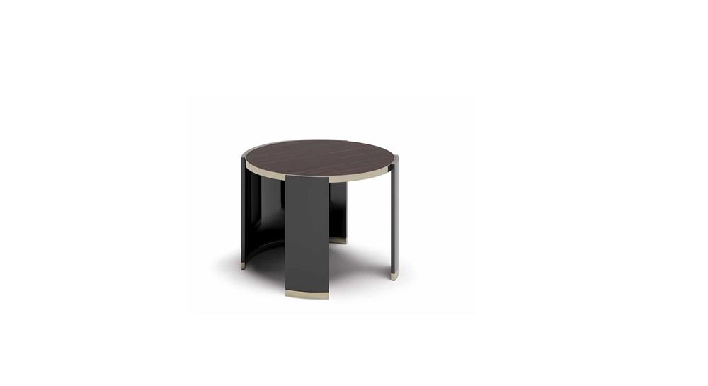 Jemne tvarovaná škrupina pojme okrúhlu dosku v drevenom alebo mramorovom prevedení. Formálne riešenia pripomínajúce sochy a rovnováha medzi tuhou štruktúrou a zaveseným objemom. Základňa je k dispozícii v lakovanej alebo ekokoži.
