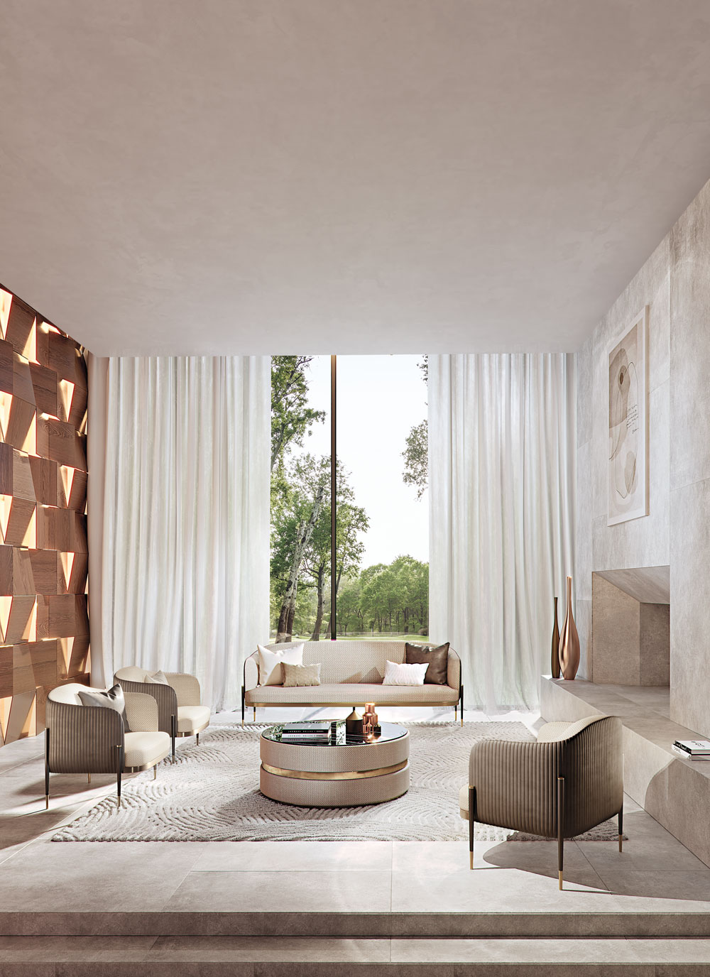 Oxford v rovnováhe medzi pevnou konštrukciou a zaveseným objemom dáva život sedadlám s mäkkým, obklopujúcim vzhľadom.