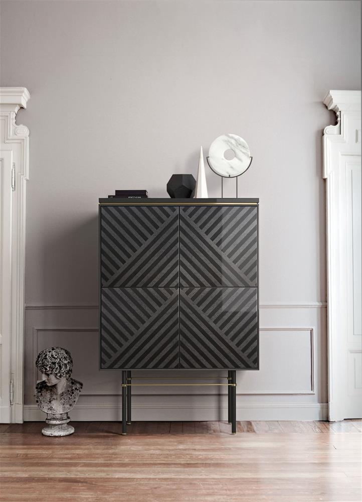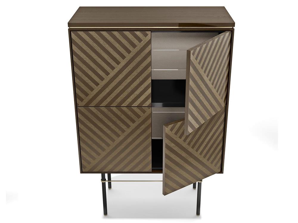 Barová skrinka je dostupná v dvoch povrchových úpravách Graphite Charcoal alebo Moka Coffee, vnútorné sklenené police, vnútorné led podsvietenie podľa vlastného výberu.