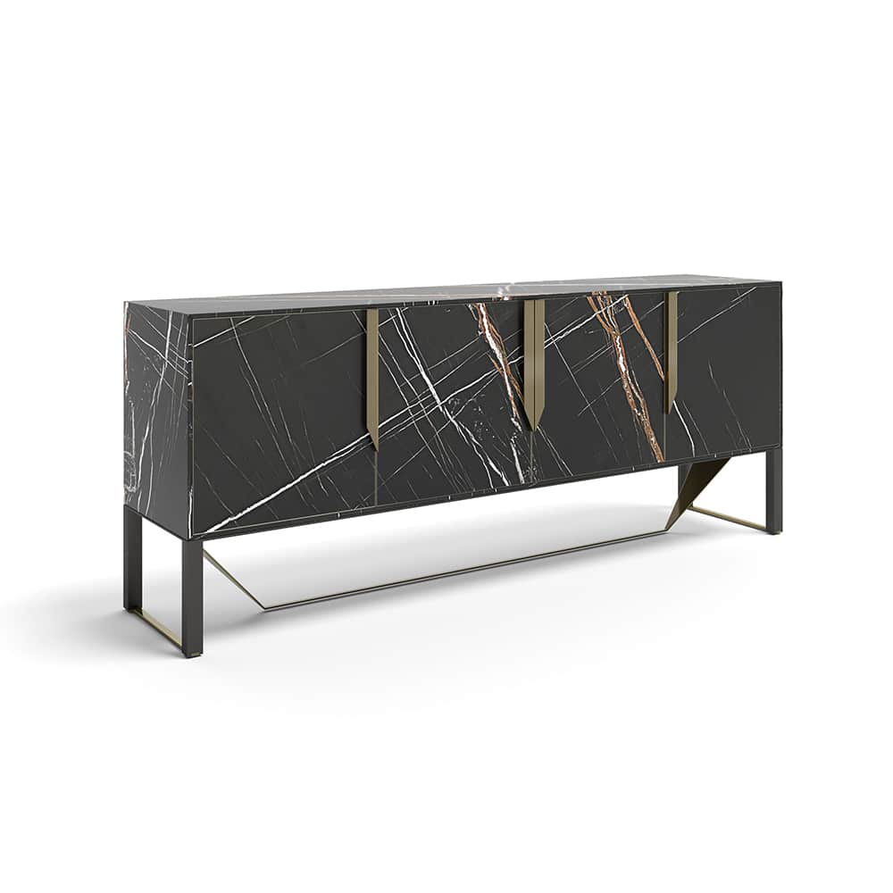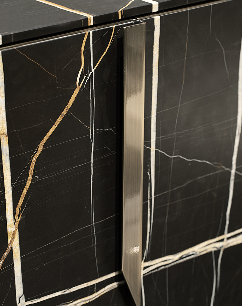 Príborník dostupný so štyrmi krídlovými dverami v lakovanom prevedení, k dispozícii aj celý pokrytý mramorom, vnútorná sklenená polica, lesklé čierne prevedenie interiéru, vnútorná LED dióda podľa vlastného výberu.