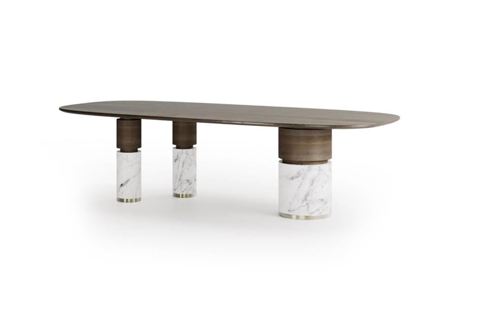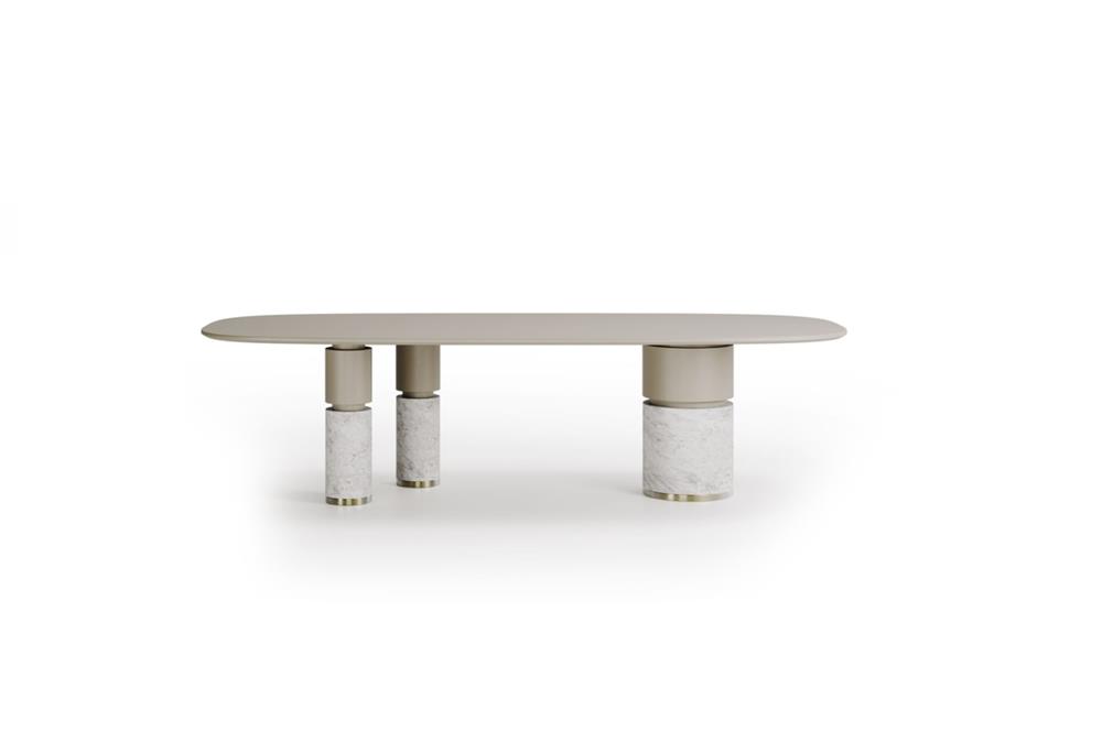 Doska z lakovaného, alebo lesklého, alebo matného dreva. Dvojvrstvové nohy charakterizované prvou časťou z lakovanej, alebo lesklej, alebo nepriehľadnej esencie a druhou časťou z mramoru. Kovové detaily.