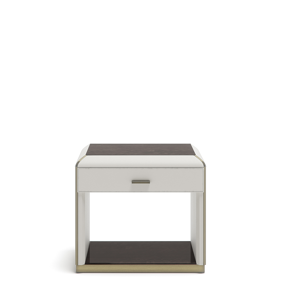 Drevený rám,povrchová úprava koža alebo ekokoža, kovové detaily, 1 zásuvka, mramorový vrch podľa vlastného výberu.
