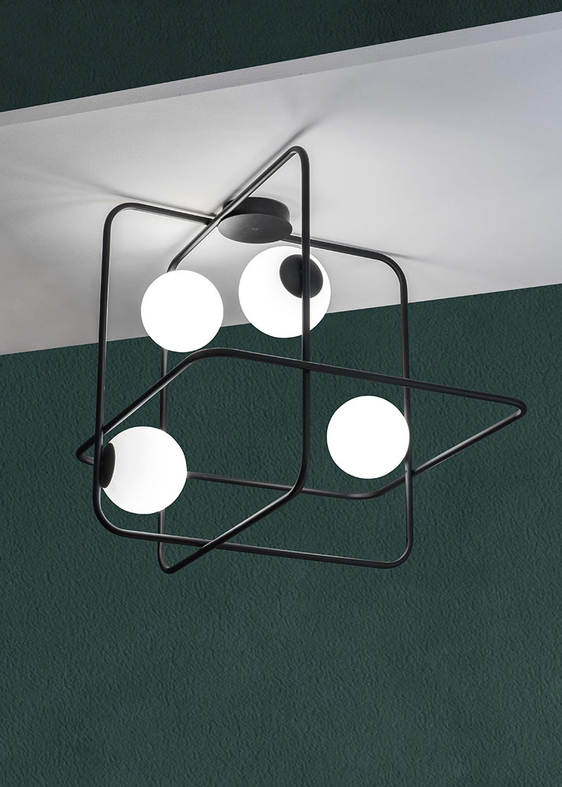 Opis: Konštrukcia vyrobená z ohýbaných oceľových rúrok a spracovaná v rôznych povrchových úpravách: saténové galvanické zlato, čiernobiele, na ktorej sú vsadené guľôčky z mliečnobieleho fúkaného skla.
