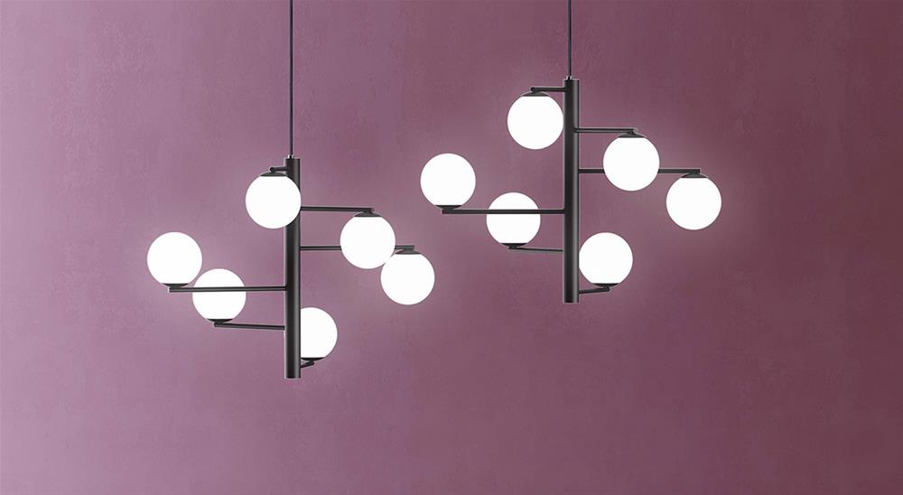 Popis: Dva geometrické tvary, valec pre kovové časti a gule pre fúkané sklo, koexistujú v harmónii a vytvárajú atmosféru, ktorá sa dá ľahko asimilovať. Povrchové úpravy sú galvanicky zlaté saténové, čierne a biele. Objímky sú E 14.