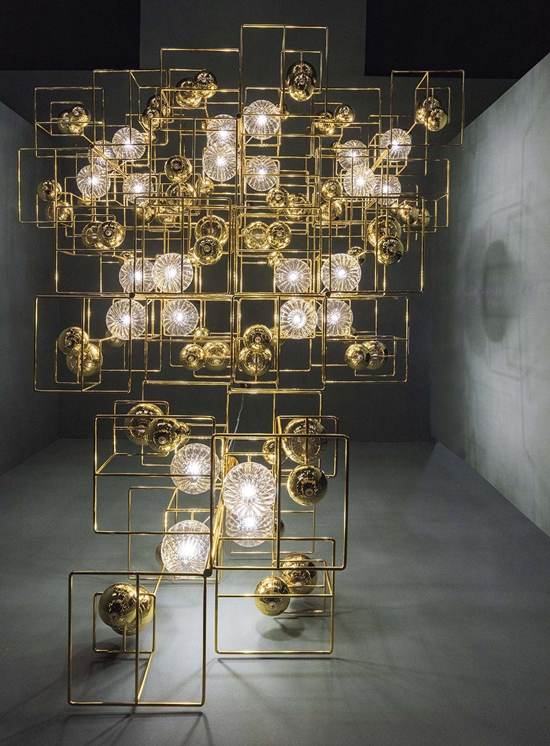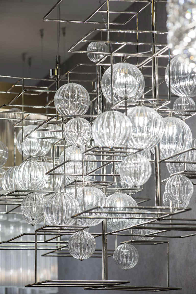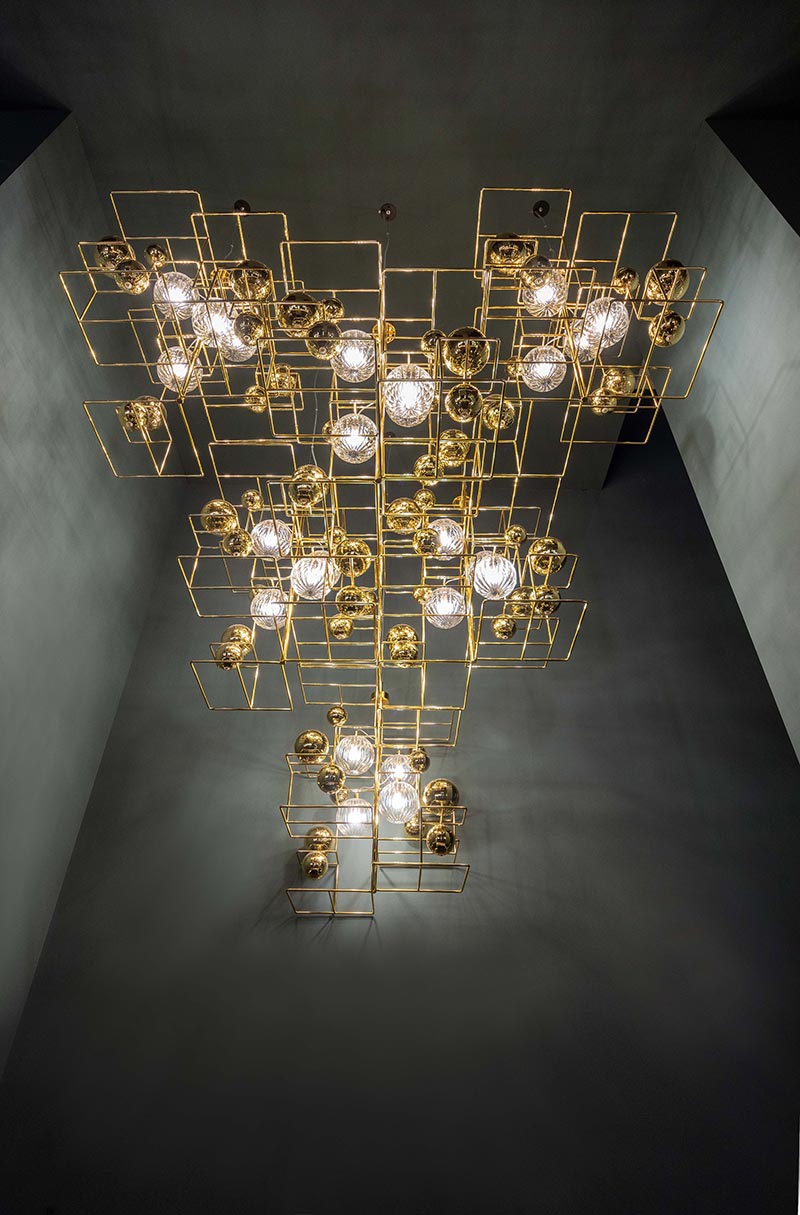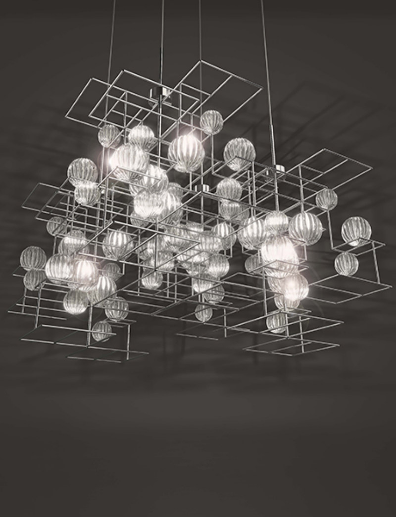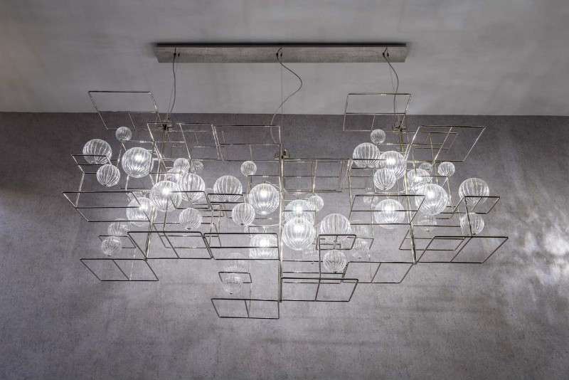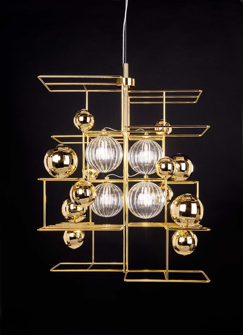 Popis: Oceľové konštrukcie sa preháňajú vytváraním geometrických tvarov, ktoré zachytávajú jemnú podstatu ručne opracovaných fúkaných sklenených gúľ, ktoré sú nasvietené vo väčších formách a vytvárajú efekty svetla a odrazy do menších foriem. Oceľové časti sú povrchovo upravené zlatým 24 karátovým galvanickým alebo galvanickým niklom. Objímka žiarovky je G9.