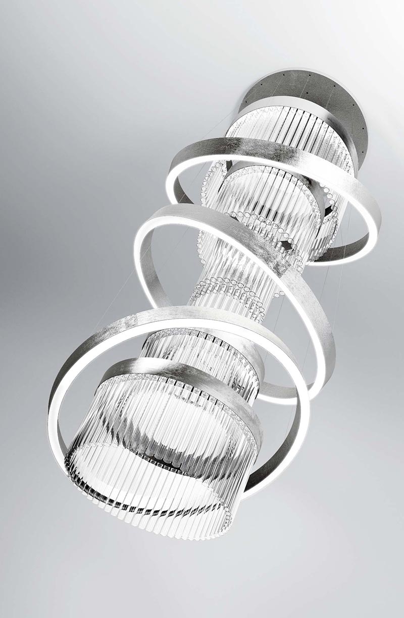 Popis: Ľahkosť fúkanej sklenenej trubice spája silu oceľovej konštrukcie ohýbanej ľudskou rukou a opracovanej tak, aby nadobudla tvary a veľkosti, ktoré sledujú tvorivé fantázie tých, ktorí radi tvoria. Krivky, lineárne úseky. Oválne alebo kruhové tvary, polkruhy, môžu byť umiestnené v rôznych výškach, čím vytvárajú veľké efektové štruktúry. Povrchové úpravy sú rôzne a výlučne interne generované. Osvetlenie je riešené špeciálnym LED pásom vo vnútri konštrukcie s čipmi otočenými o 90° pre vytvorenie rovnomerného svetla pre všetky sklenené trubice.