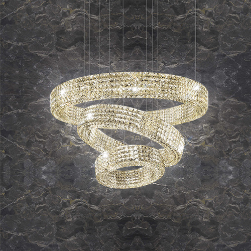 Opis: Kované oceľové krúžky rôznych veľkostí a vyrobené na mieru ako vysoko módne šaty. Dizajnérska fantázia môže počítať s veľkosťou kryštálov výnimočnej krásy. Je to WATER CRISTAL, ktorý osvetlený nepriamym svetlom LED diód vytvára jedinečný efekt. Efekt WATER CRYSTAL vychádza z experimentov v laboratóriu Marchetti. Špeciálny chemický proces, ktorý zachytáva vodu do kryštálu, ktorý fúkaný dusíkom kryštalizuje a vytvára úžasné efekty. Povrchové úpravy sú plátkové zlato, plátkové striebro, plátkové medené, všetko vyrobené ručne, tiež galvanicky brúsené saténové zlato. LED osvetlenie.