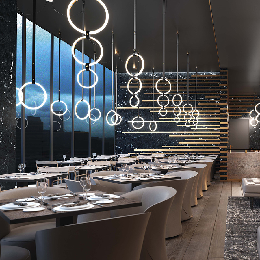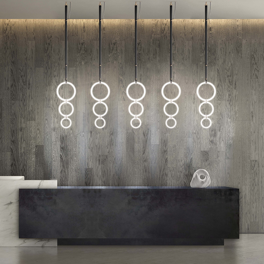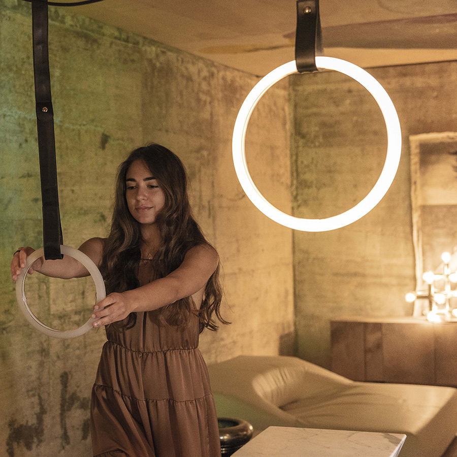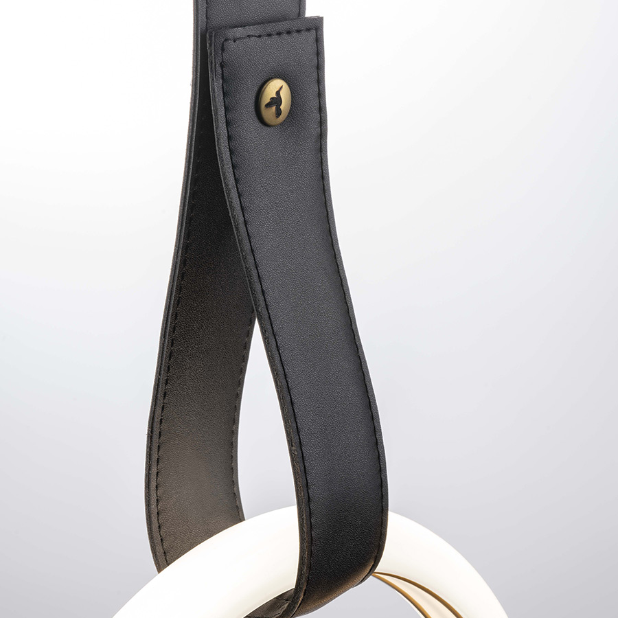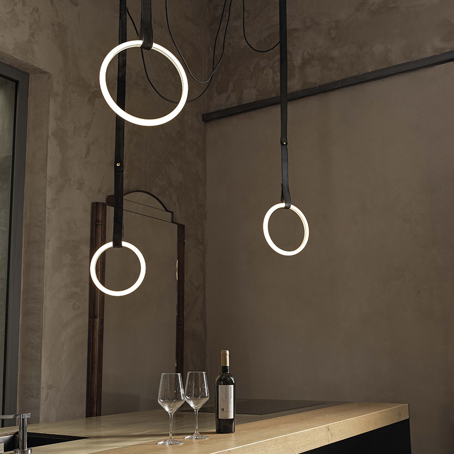 Keď sa koža a prstene navzájom spoja, prenášajú energiu a rozptyľujú svetlo do okolia. Nie je to len svietidlo, ale je to kus nábytku a dekoratívny doplnok moderného charakteru.