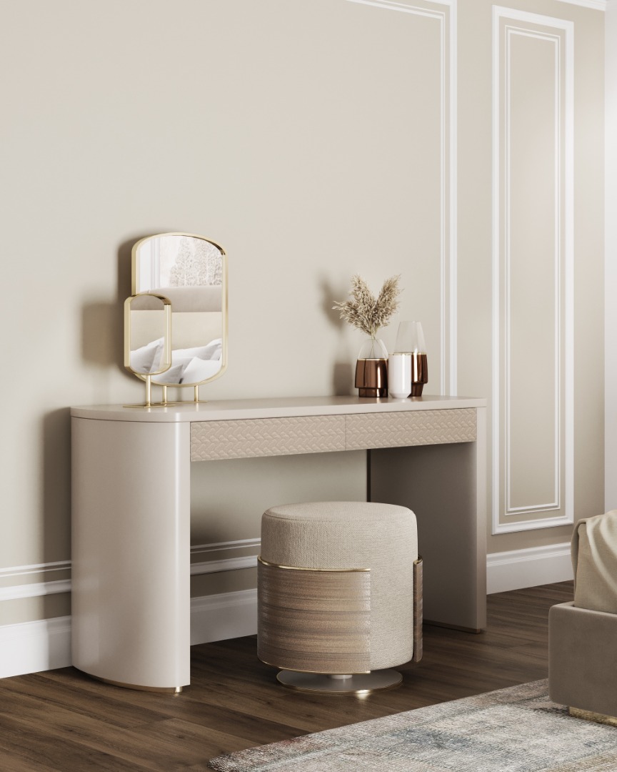 Náš toaletný stolík MOA je pastvou pre oči. Majiteľ jemného tvaru, s vznešenou eleganciou, má luxusný nádych zdôraznený zásuvkami obloženými kožou a mosadznými detailmi.