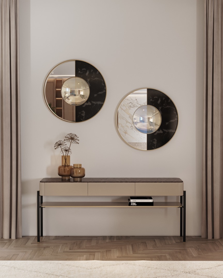 Jednoduchý, no jedinečný luxusný predmet, ktorý zachytáva funkčnosť zrkadla aj nádheru umeleckého diela.