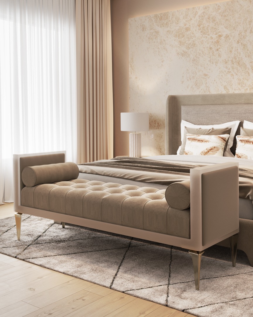 Lavička Antoinette bola inšpirovaná francúzskym dvorom z 18. storočia. Je to veľmi luxusný kúsok s jemným zamatovým čalúnením, krásnym dreveným rámom a pozlátenými kovovými nohami. Tento kúsok je najlepším sídlom každého očarujúceho priestoru.