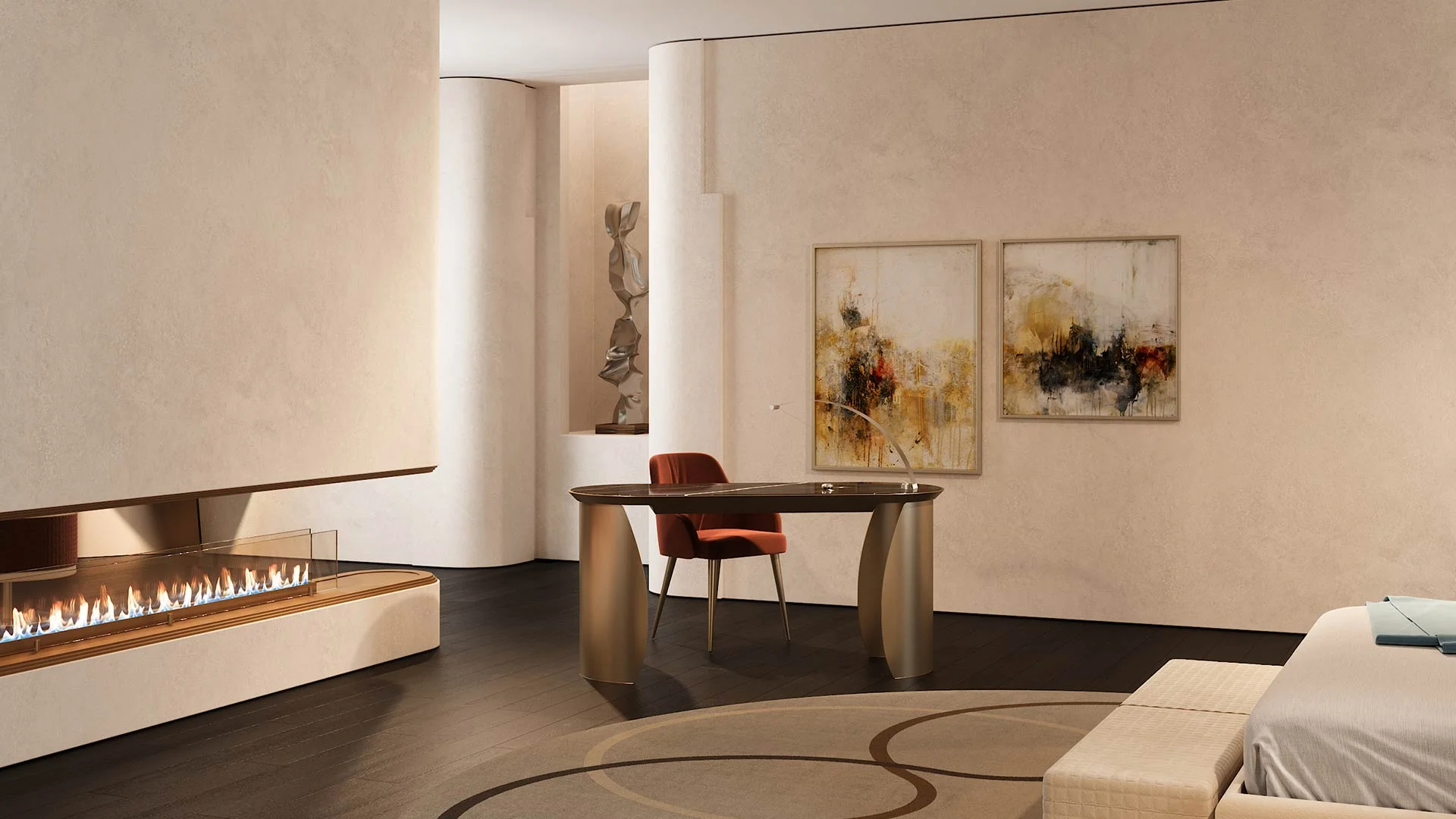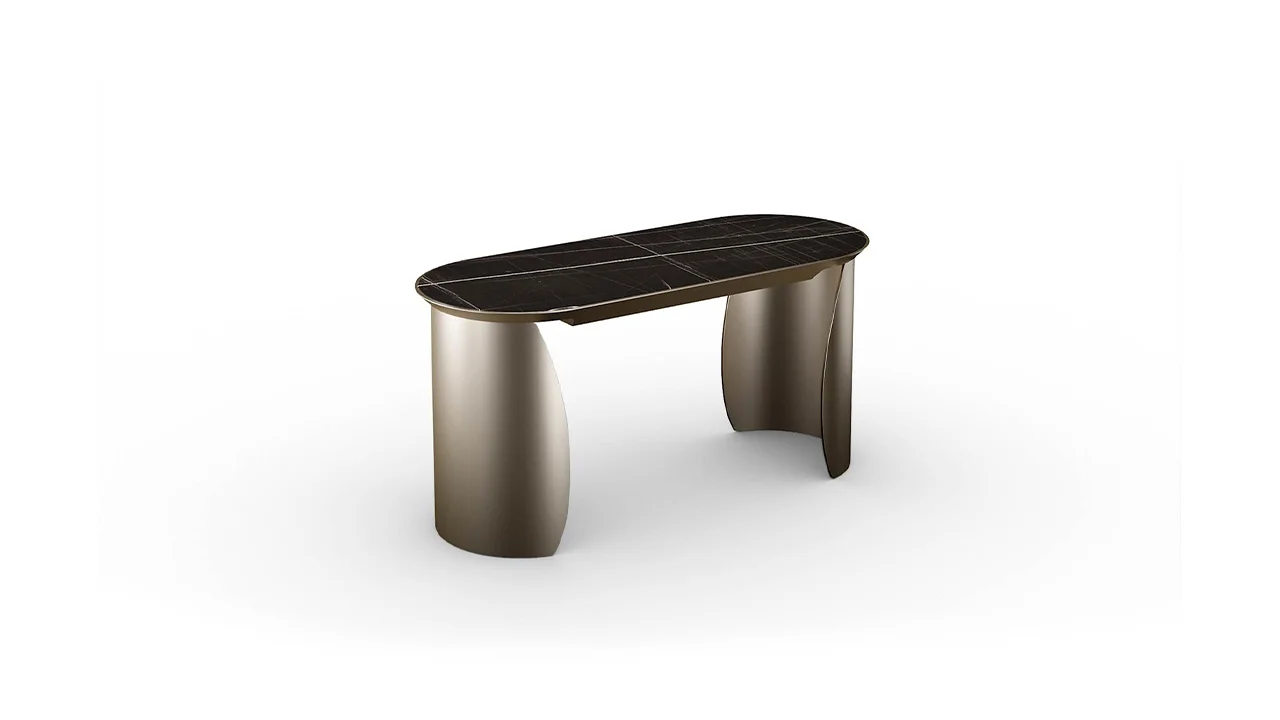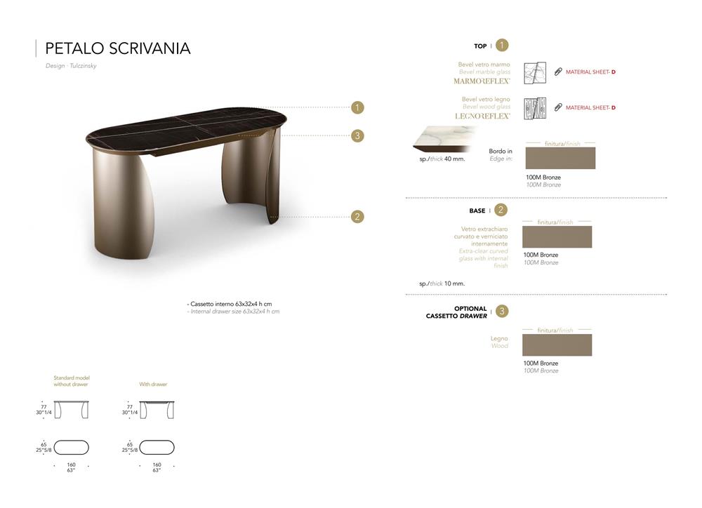 Stôl s podnožami z extra číreho zakriveného skla s hrúbkou 10 mm s vnútorným bronzovým povrchom. Fazeta Drevená doska 40mm tl. v bronzovom prevedení s krytom z MarmoReflex. Voliteľná zásuvka.