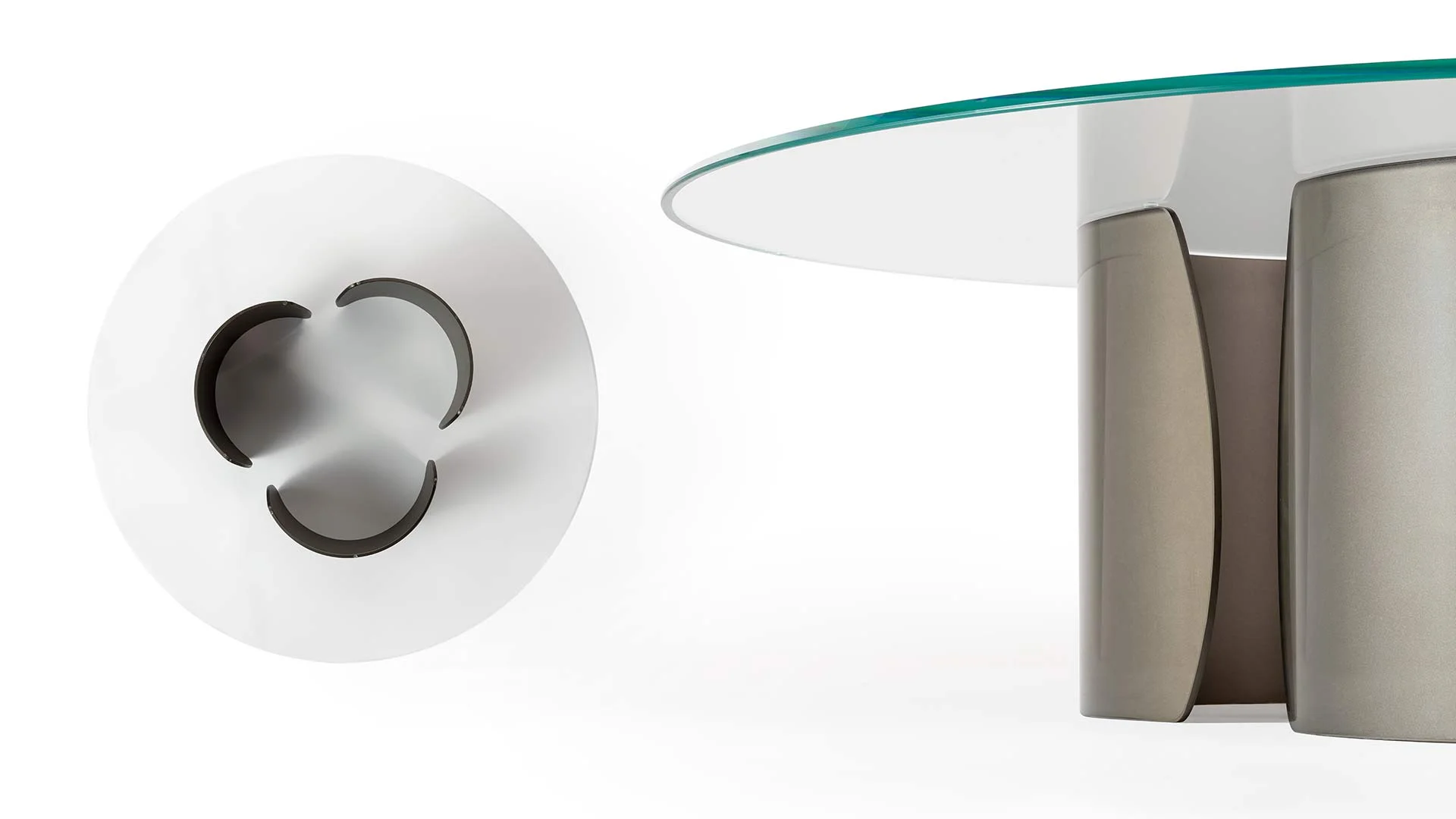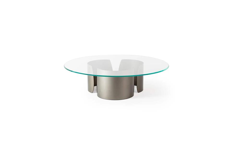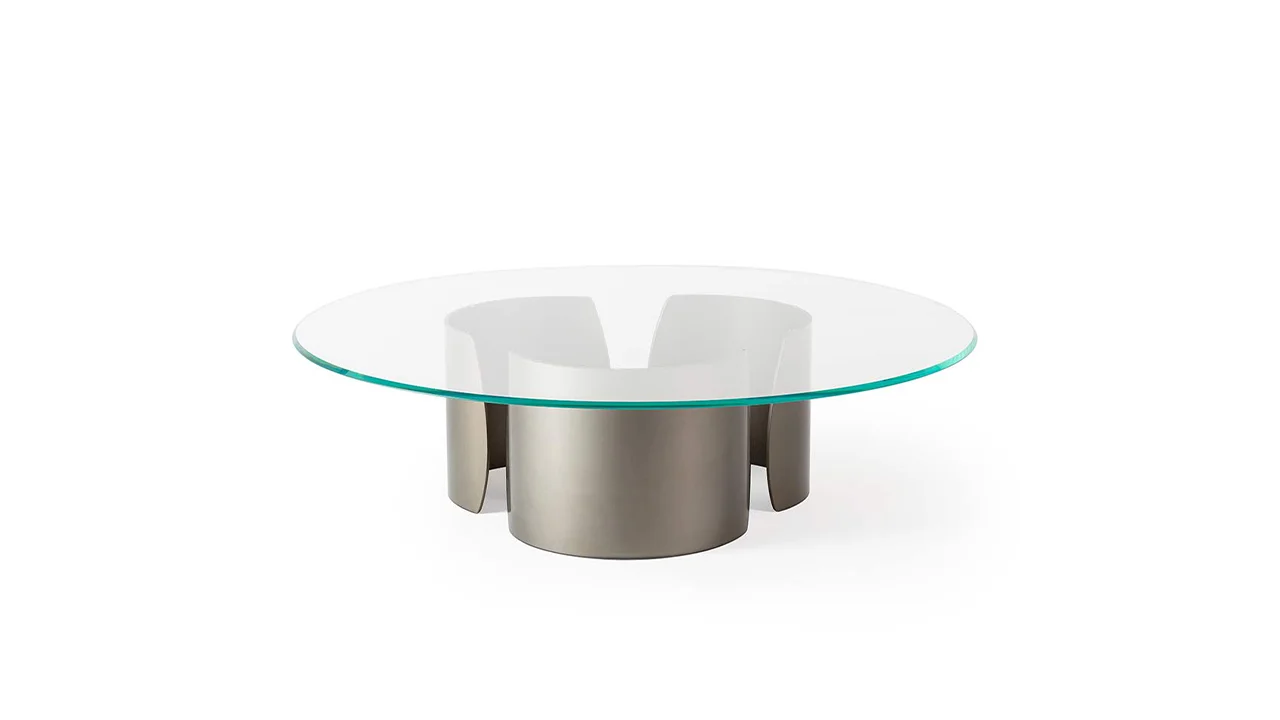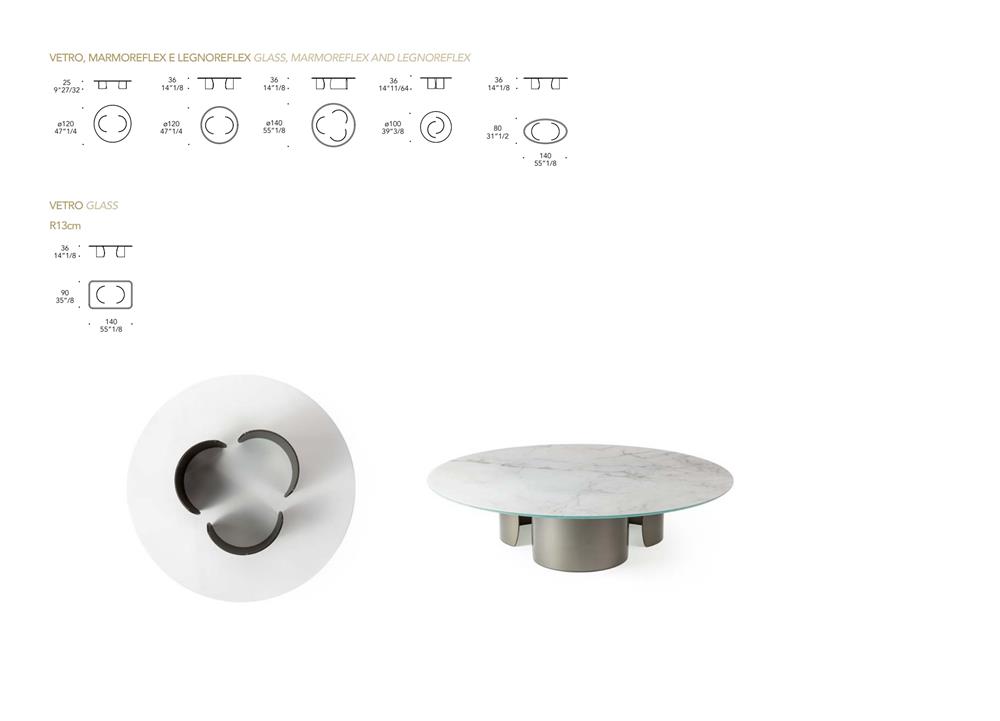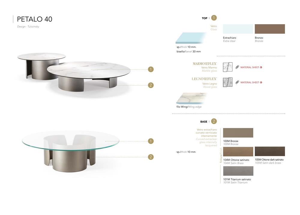 Konferenčný stolík s podstavcami z extra číreho zakriveného skla s hrúbkou 10 mm s vnútorným bronzovým povrchom. Skosená doska z extra číreho alebo bronzového skla, z MarmoReflex alebo LegnoReflex.