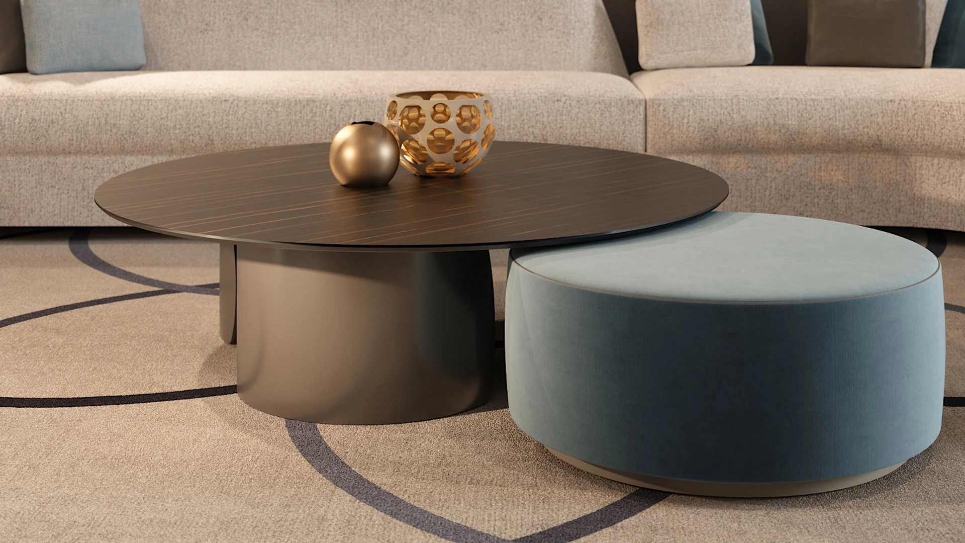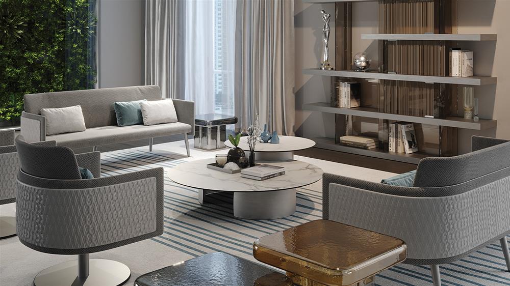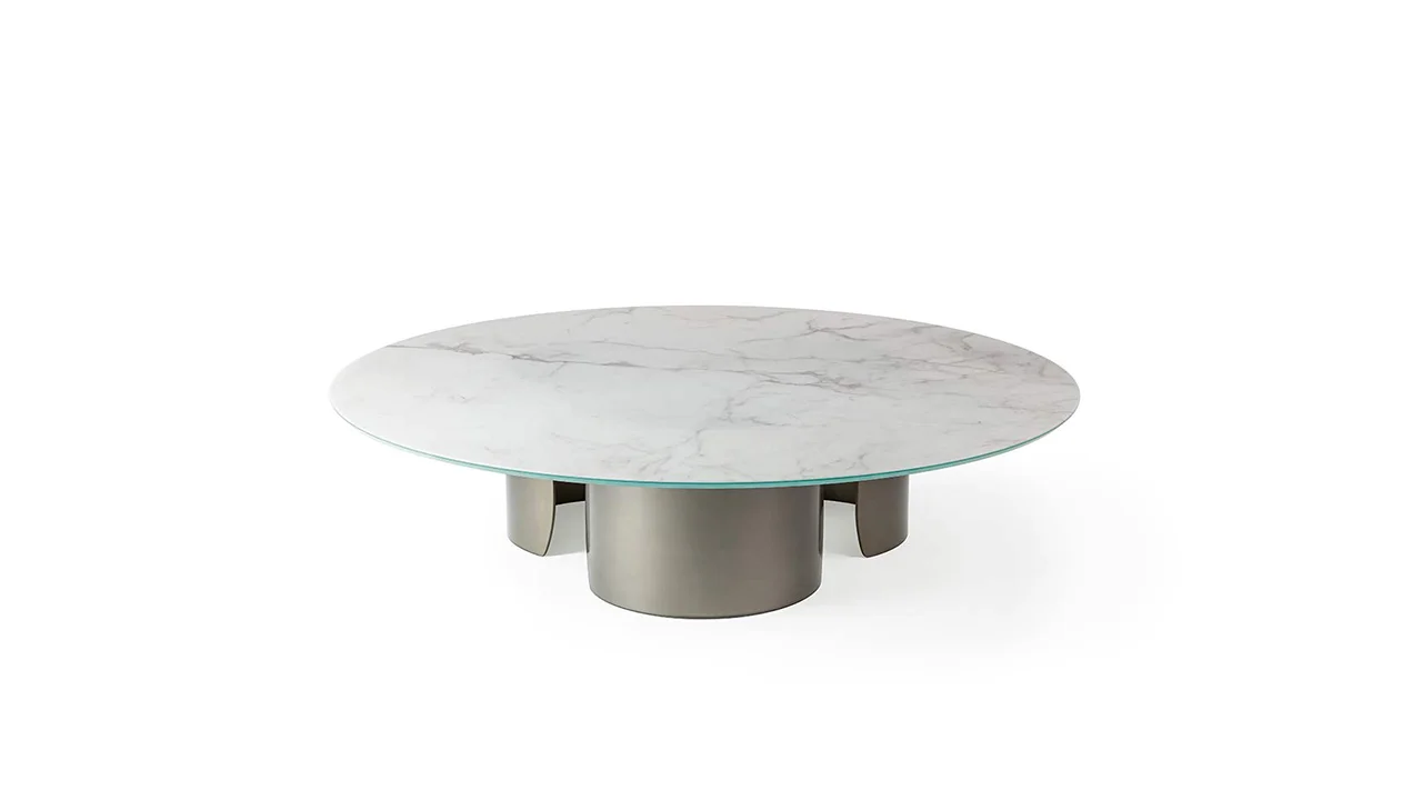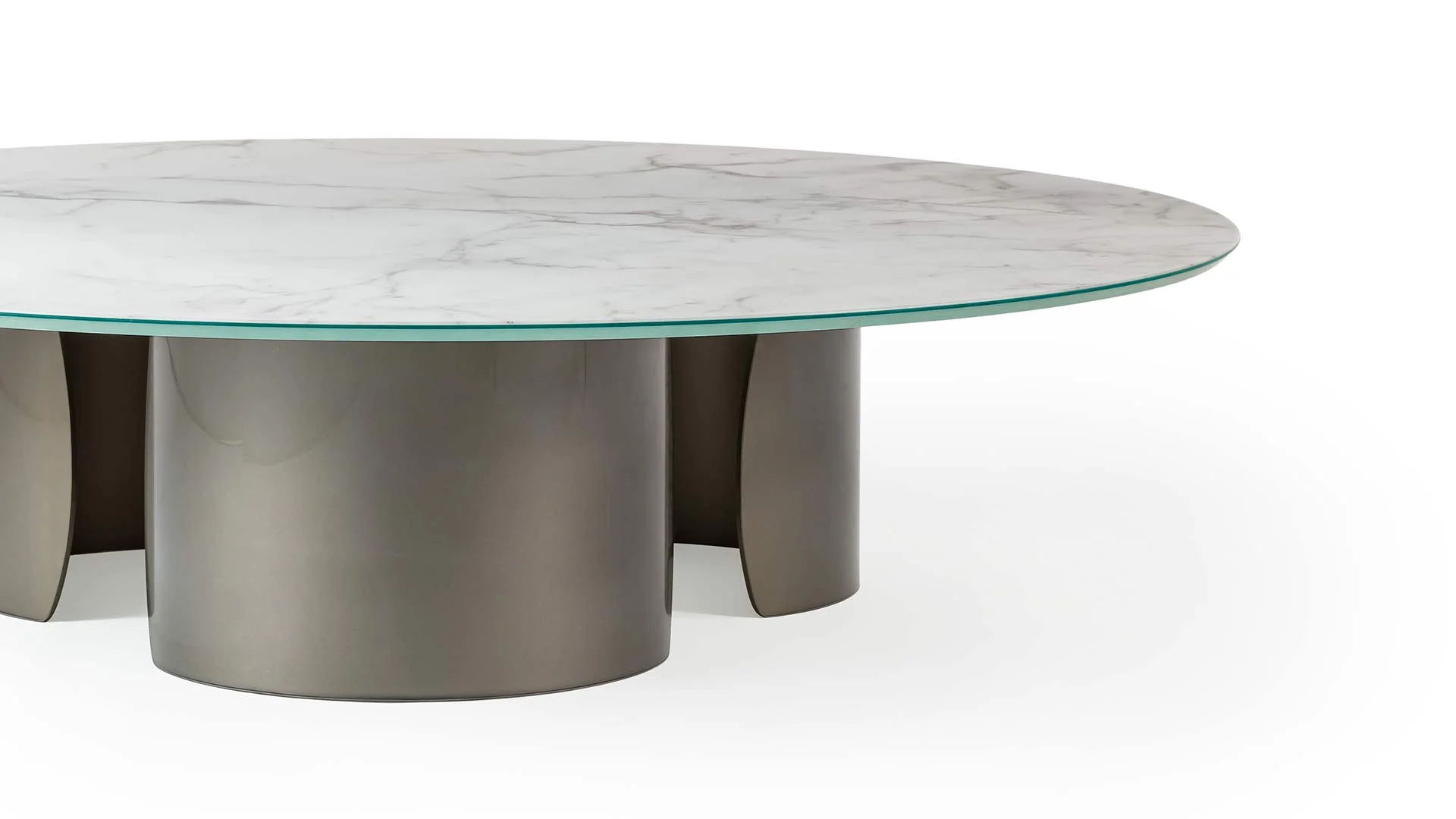 Konferenčný stolík s podstavcami z extra číreho zakriveného skla s hrúbkou 10 mm s vnútorným bronzovým povrchom. Skosená doska z extra číreho alebo bronzového skla, z MarmoReflex alebo LegnoReflex.