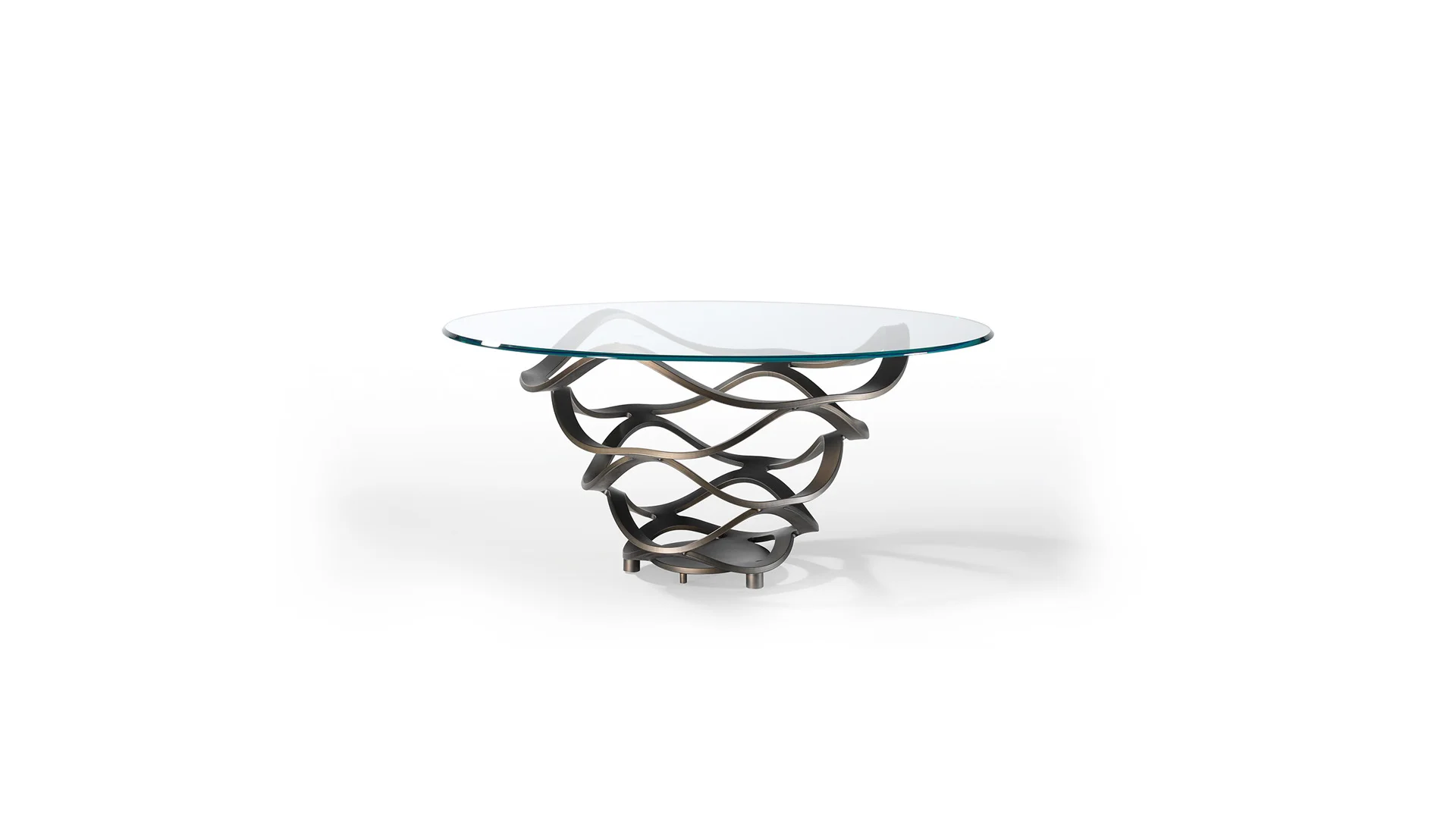 Jedálenský stôl s okrúhlou, alebo oválnou podnožou zo zakriveného skla s hrúbkou 24 mm, priehľadné alebo čierne lakované. Dostupné aj v extra čírom skle s hrúbkou 19 mm. Sklenená doska s hrúbkou 15 mm so skosením 45°.