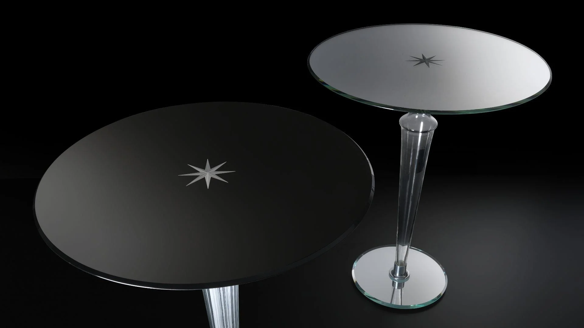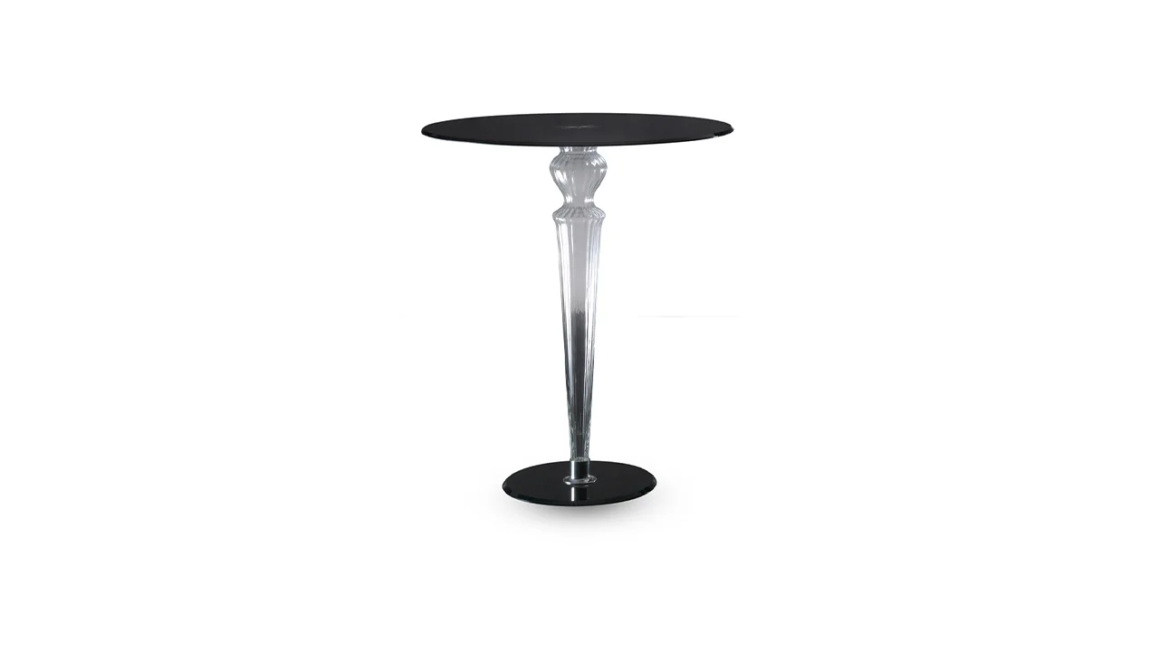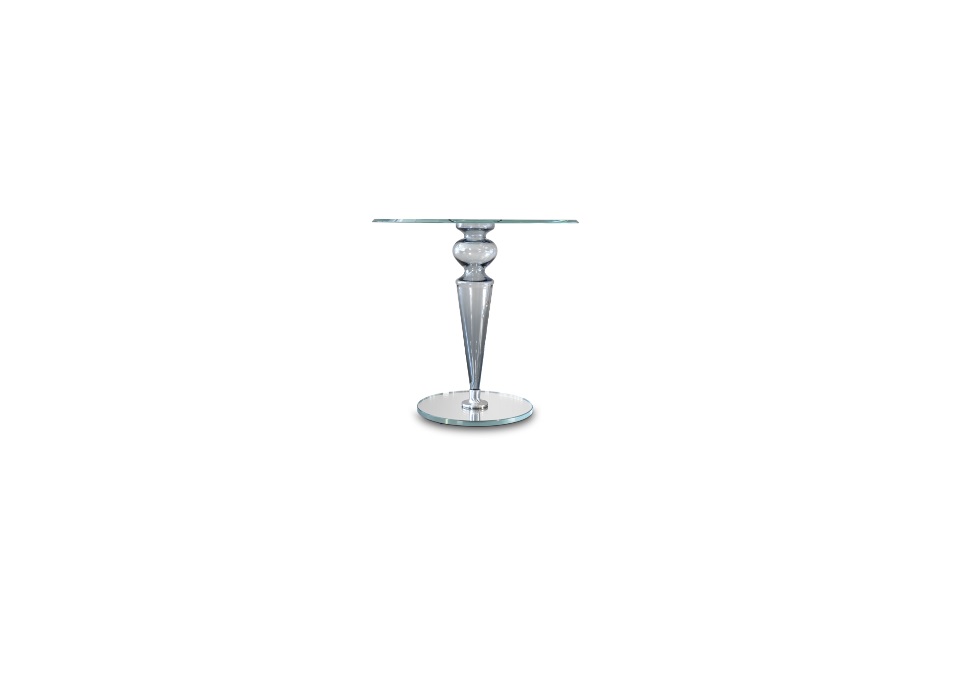 Barový stôl s nohou z muránskeho skla hladké v priehľadnom alebo farebnom prevedení alebo rebrovaný v priehľadnom alebo zlatom prevedení. Upevňovací diel z chrómovaného hliníka na priehľadnom alebo zrkadlovom skle. Vrch so skosením z priehľadného, zrkadlového alebo čierneho lakovaného skla.