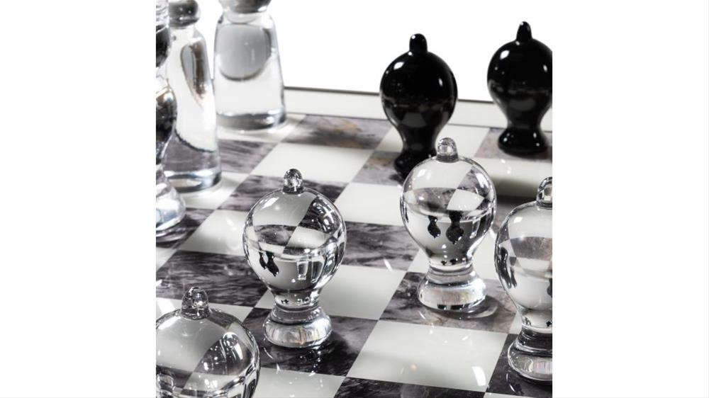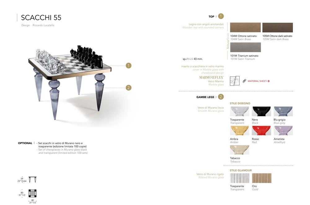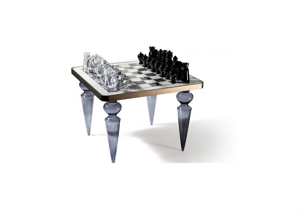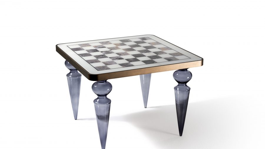 Hrací stolík s nohami z muránskeho skla dostupný v hladkom prevedení, číry alebo farebný alebo v rebrovanom prevedení, priehľadný alebo zlatý. Drevená doska so zaoblenými rohmi v saténovej metalickej povrchovej úprave a vložkou z mramorového skla so šachovnicovým dizajnom.