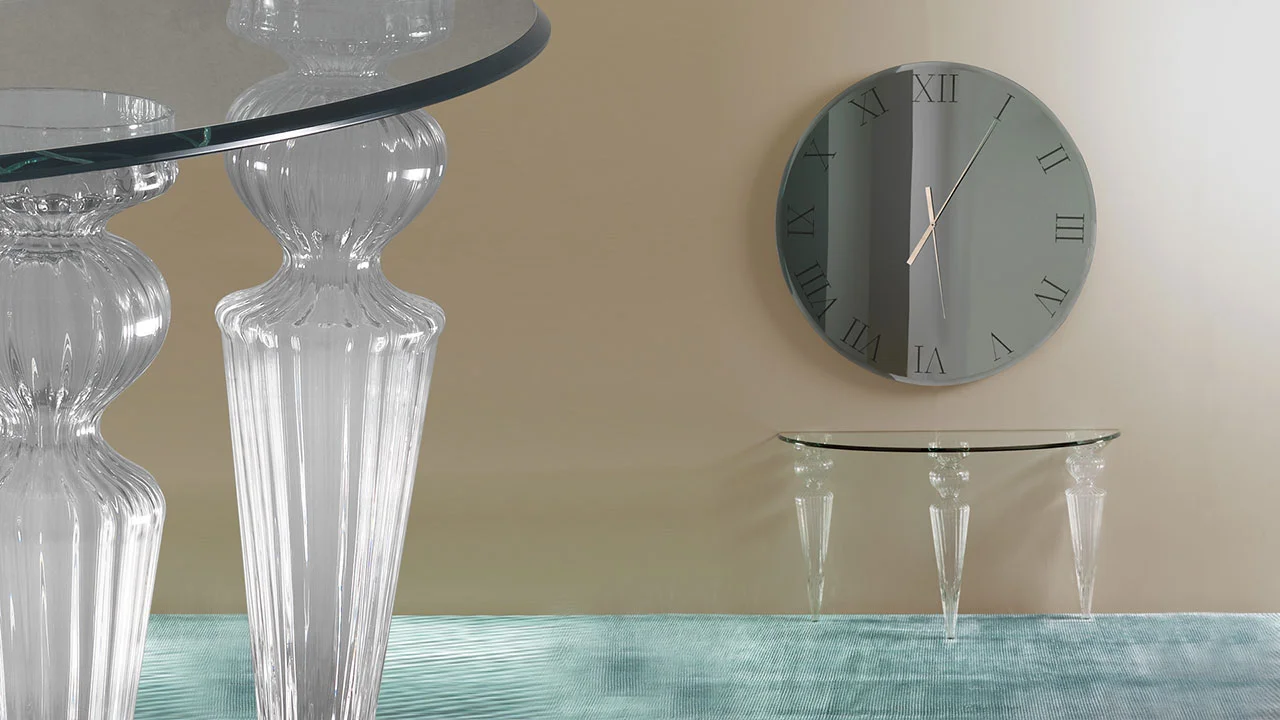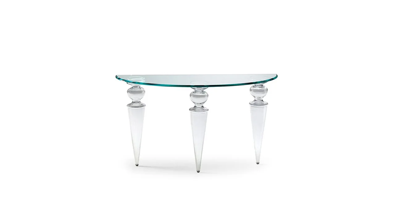 Konzola s nožičkami z priehľadného skla Murano, farebná alebo platino úprava alebo rebrovaná priehľadná alebo zlatá. Sklenená doska hrúbka 15 mm so skosením 45°.;