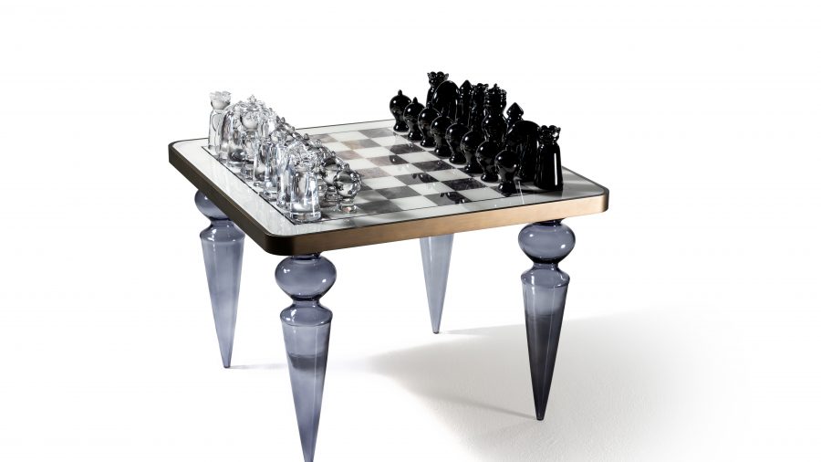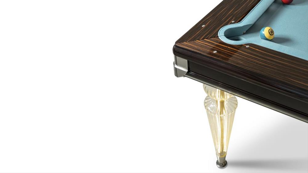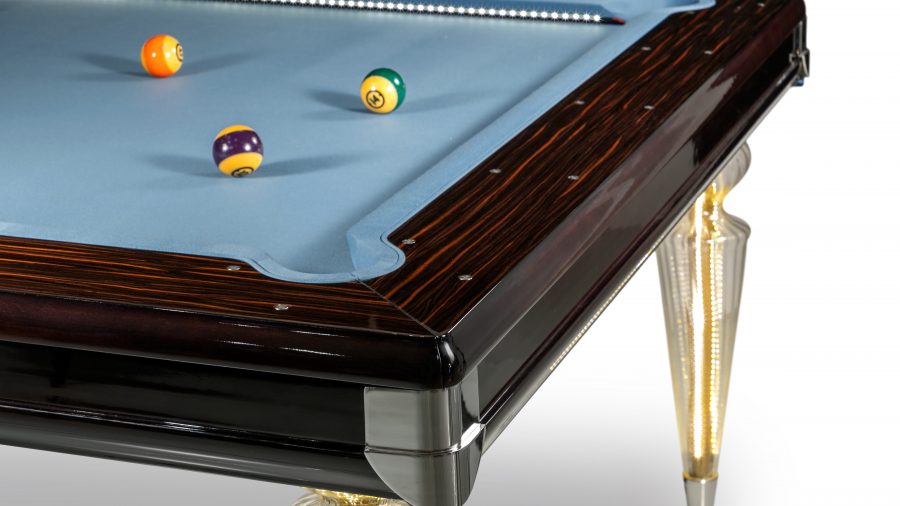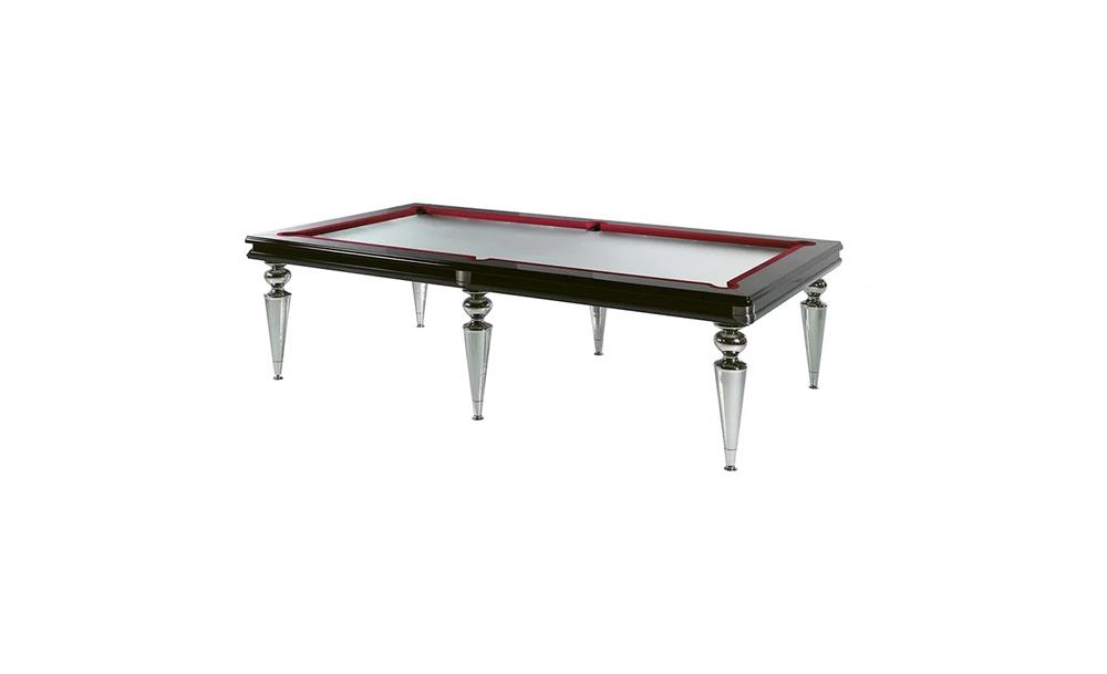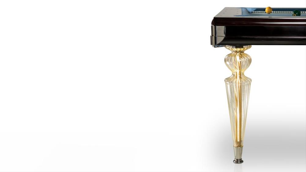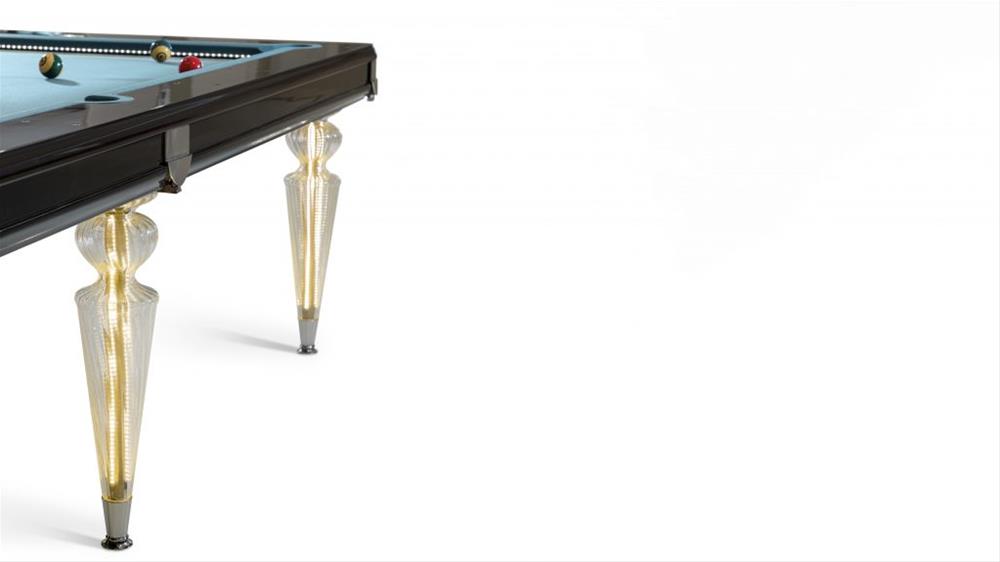 Biliardový stôl s doskou pokrytou hracou plsťou. Lesklá lakovaná drevená konštrukcia. Nohy zo skla Murano, priehľadné, farebné alebo v prevedení Platinum. Voliteľné LED osvetlenie hornej časti a nôh a držiak na tága v zrkadlovom skle.