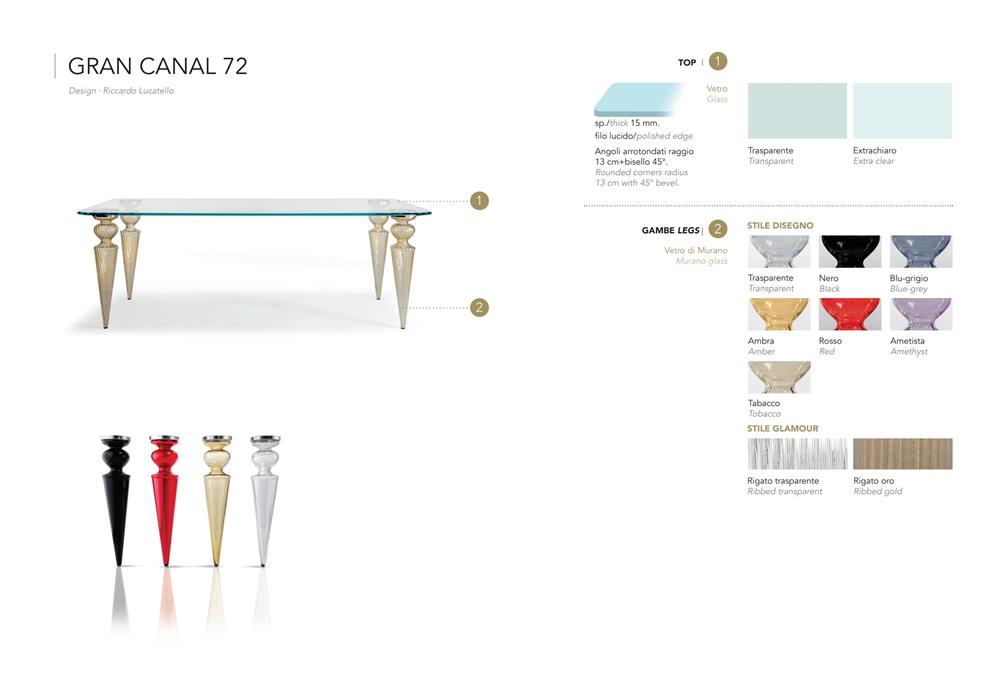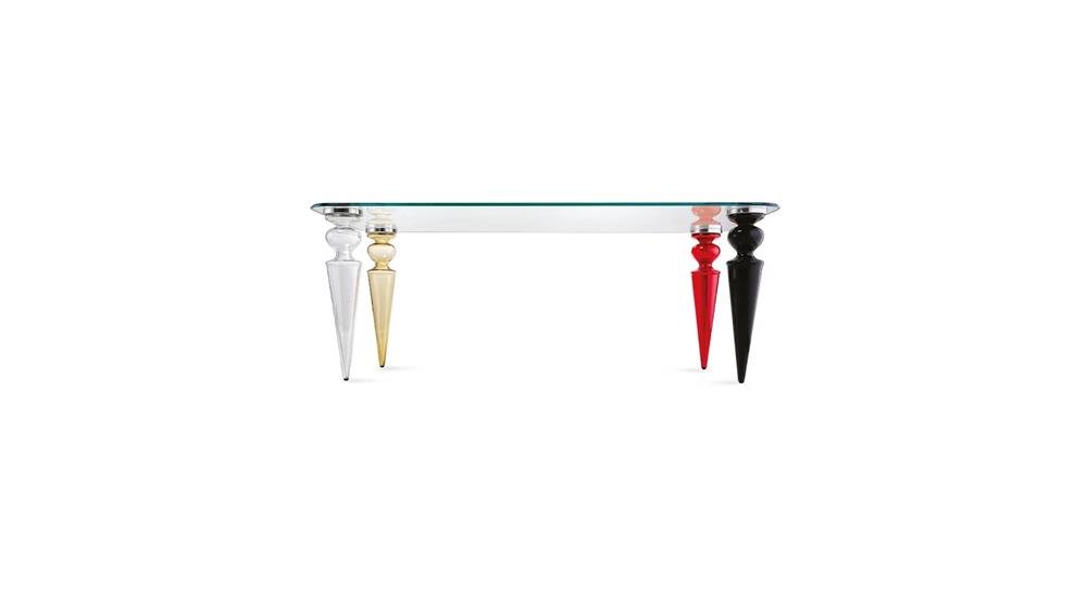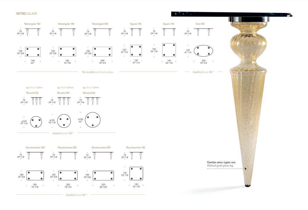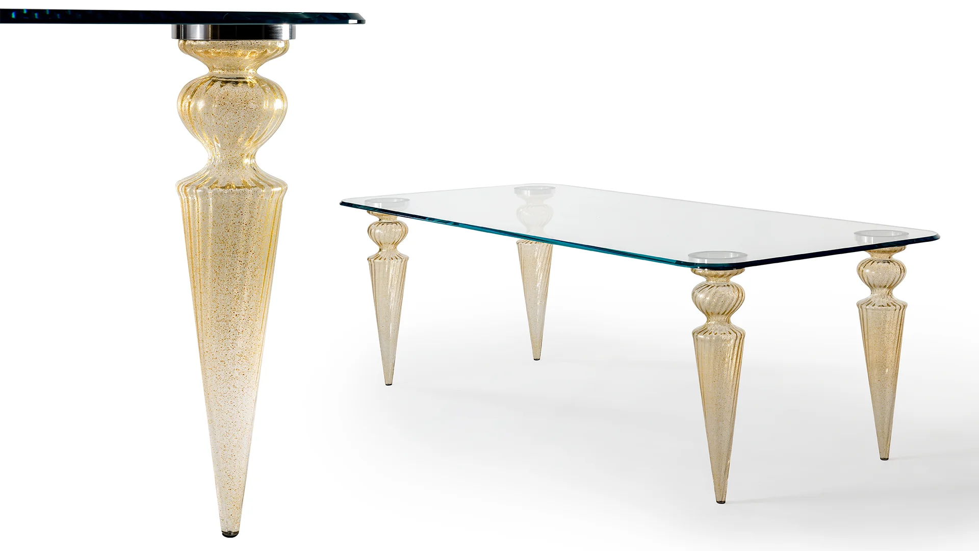 Jedálenský stôl s nohami z muránskeho skla dostupný v priehľadnom, rebrovanom, rebrovanom zlate, farebnom alebo platinovom prevedení.