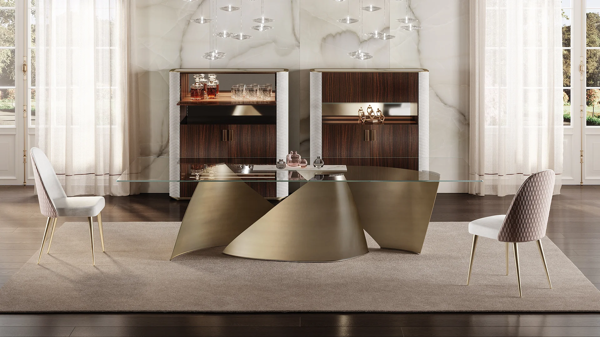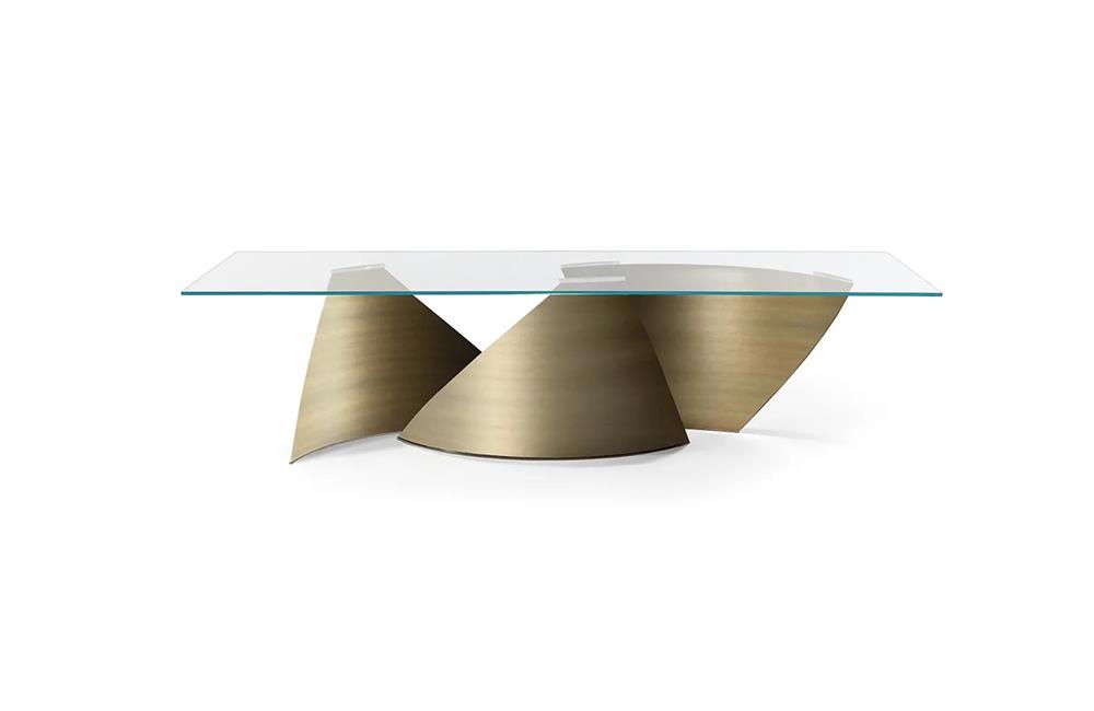 Jedálenský stôl so zakrivenými kovovými podnožami v saténovom prevedení: mosadz, tmavá mosadz, titán. Sklenená doska s hrúbkou 15 mm s leštenými hranami.