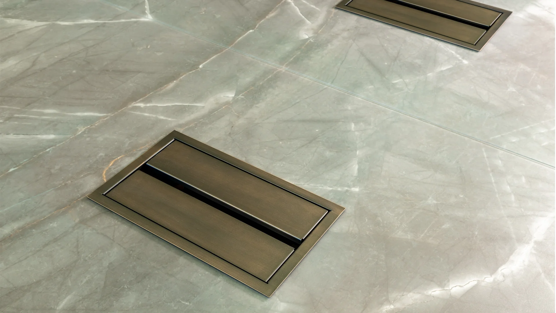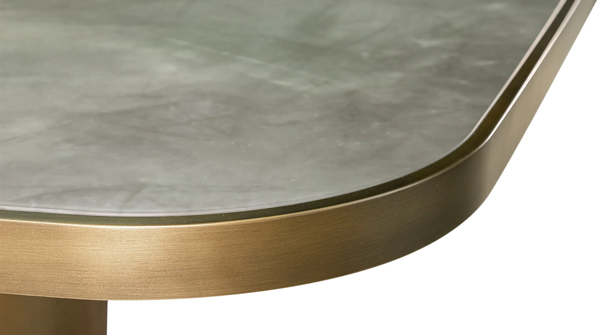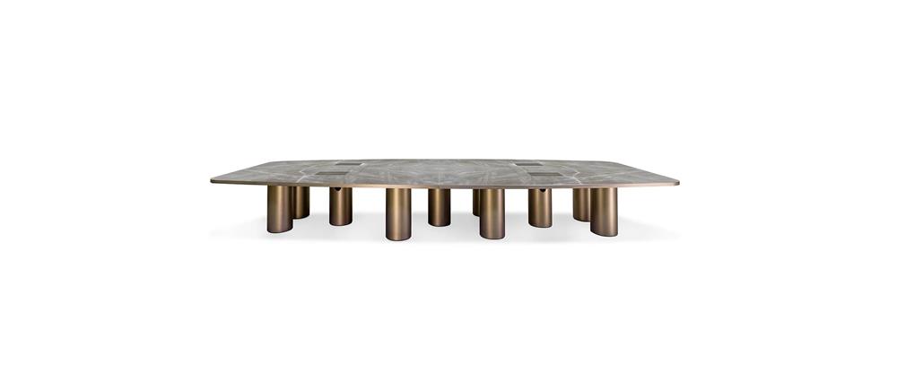 Kancelársky stôl s podnožou zloženou z desiatich valcov v prevedení saténovej mosadze. Drevená doska v zladenej povrchovej úprave so 40 mm hrubým okrajom a s vložkou Marmoreflex.