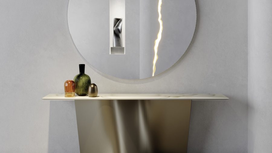 Konzola so základňou zo zakriveného extra číreho skla s hrúbkou 15 mm s povrchovou úpravou bronz, mosadz, tmavá mosadz a titán. Obdĺžnikový vrch z trasnaprentu alebo z extra číreho skla