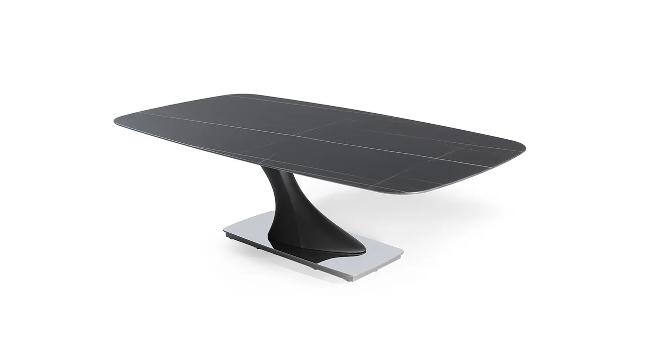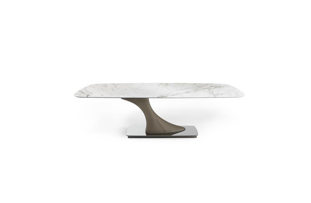 Jedálenský stôl. Nohy potiahnuté kožou Naturale alebo Nabuk. Kovová podpera a podstavec v bronzovom prevedení alebo v saténovej metalickej povrchovej úprave. Vrchná časť z extra číreho skla, MarmoReflex alebo LegnoReflex.