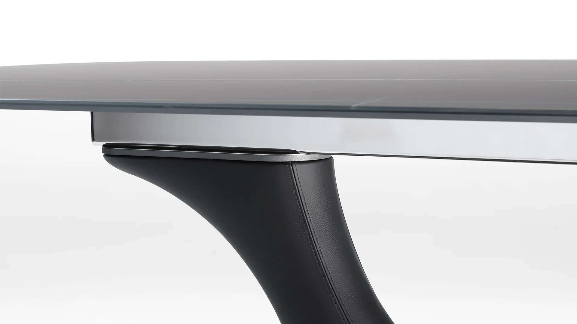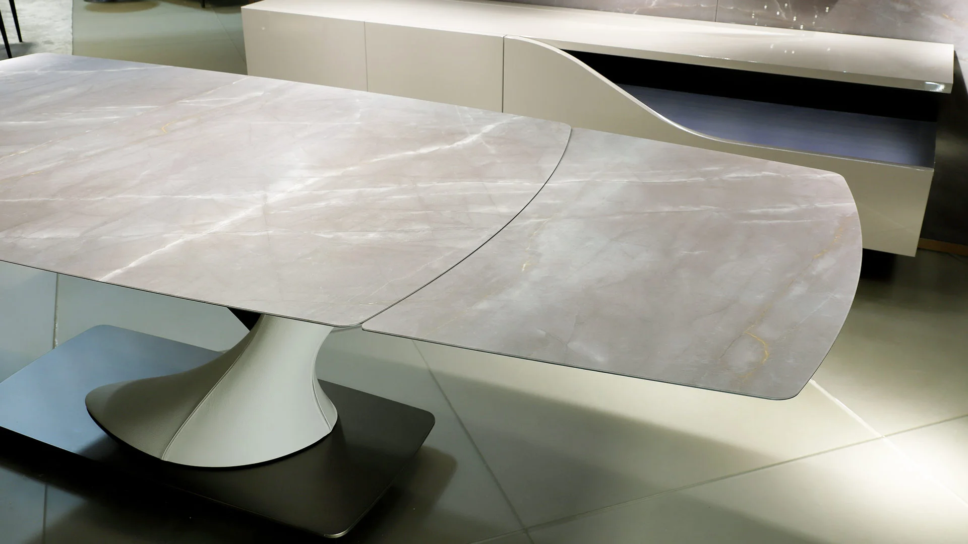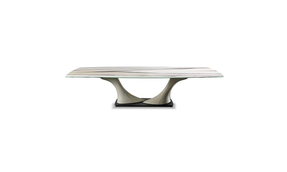 Rozťahovací jedálenský stôl s batériovým elektrickým mechanizmom s diaľkovým ovládaním. K dispozícii s 1 nadstavcom a jednoduchou základňou alebo s dvojitou základňou s 2 nadstavcami. Nohy potiahnuté kožou na kovovom podstavci lakované saténovou mosadzou alebo titánom. Vrchná doska z 15 mm hrubého mramorového skla.