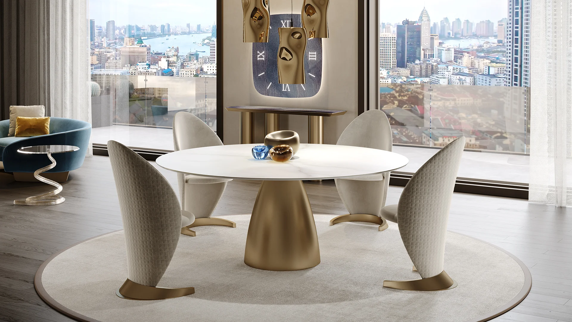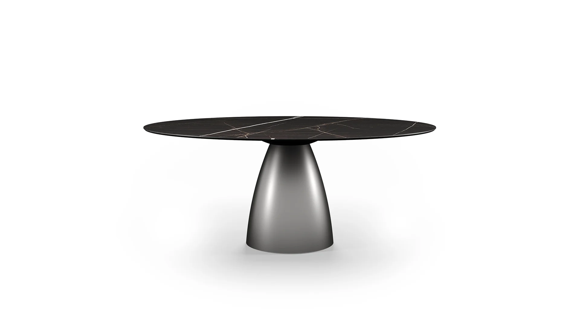 Jedálenský stôl s doskou z materiálu Marmoreflex/Legnoreflex, okraj Wing. Kovový podstavec v prevedení bronz (100M), mosadz (104M), tmavá mosadz (105M), titán (101M).