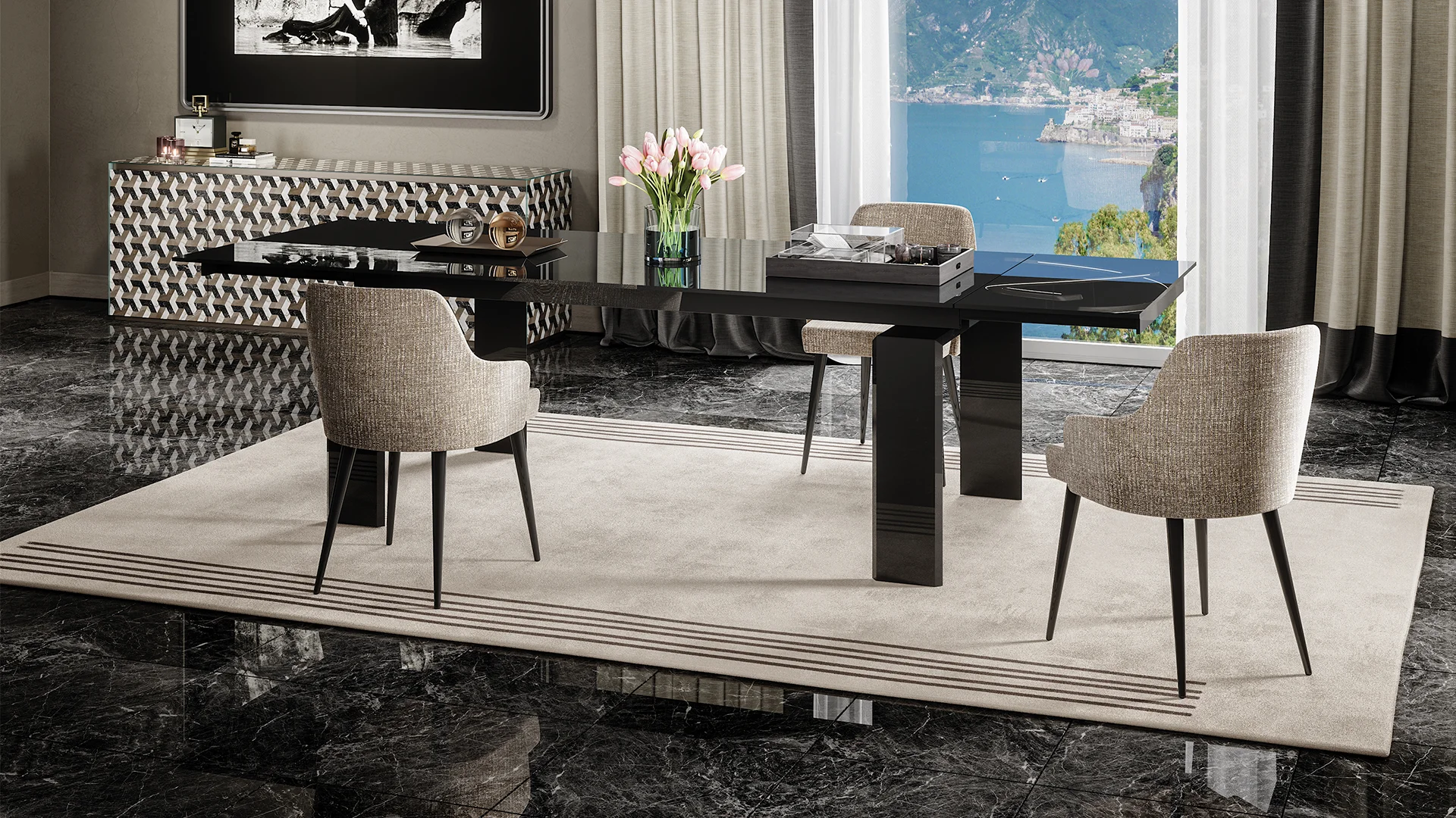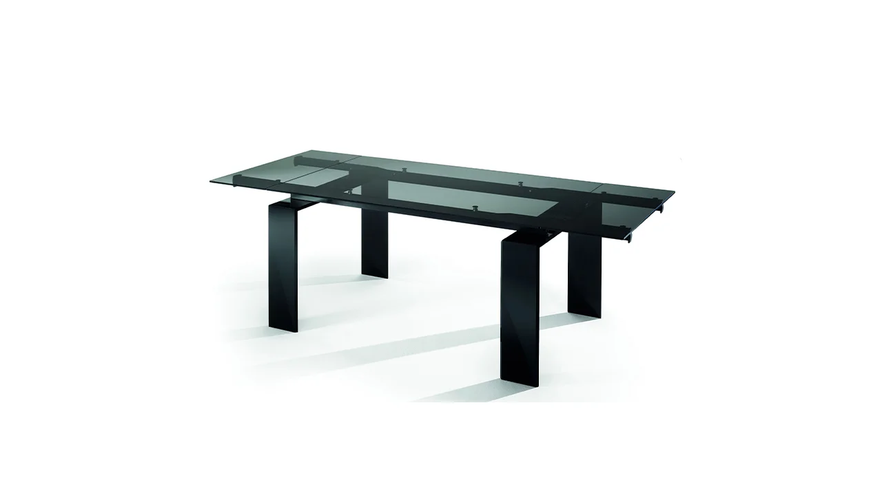 Predlžovací stôl s doskou a nadstavcami zo skla Marmoreflex/Legnoreflex. Hliníková konštrukcia, brúsená povrchová úprava. Nohy z extra číreho skla s hrúbkou 15 mm, priehľadné alebo z mosadze, mosadz tmavá, povrchová úprava titán.