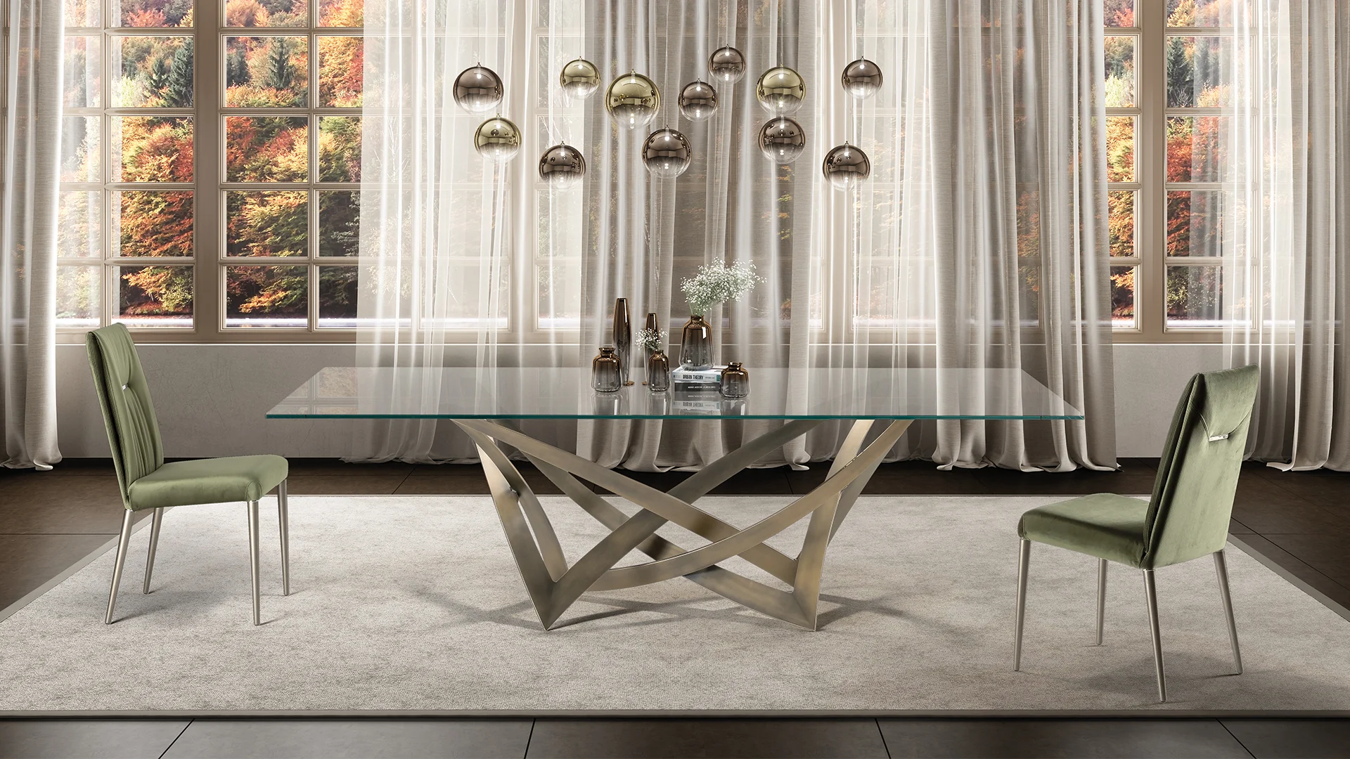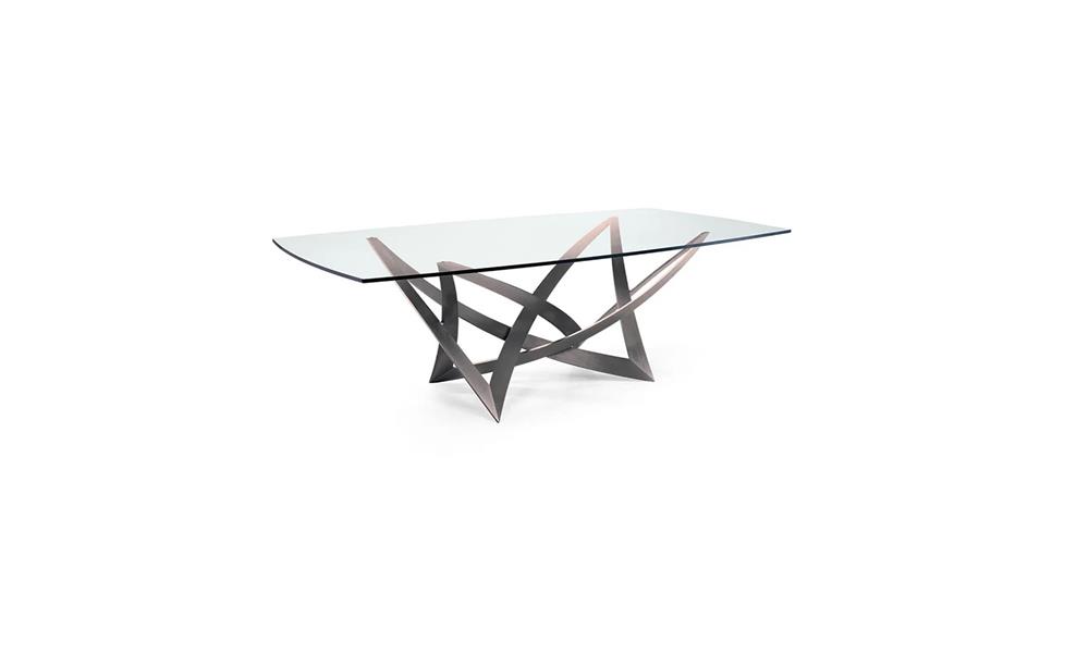 Jedálenský stôl s podnožou z brúsenej ocele. Sklenená doska s hrúbkou 15 mm s leštenými hranami, súdkovitý alebo obdĺžnikový.