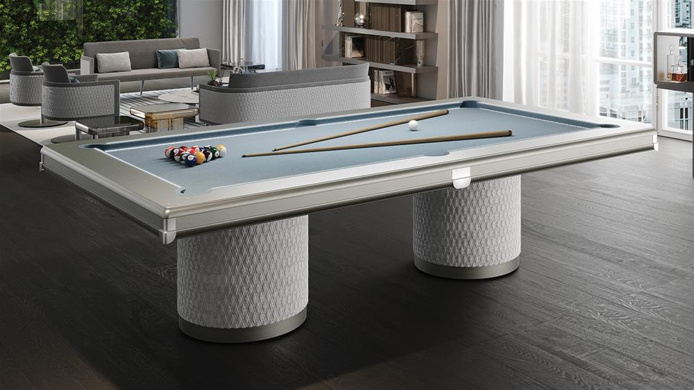 Biliardový stôl s doskou pokrytou hracou plsťou. Lakovaná drevená konštrukcia v bronze 100M, saténovej mosadzi 104M, saténovej tmavej mosadzi 105M a saténovej titánovej 101M. Nohy lakované rovnako ako konštrukcia a čalúnené kožou s prešívaním. LED osvetľovací systém na vrchu. Voliteľné: Držiak biliardových tág zo zrkadlového skla s extra čírymi sklenenými podperami.
