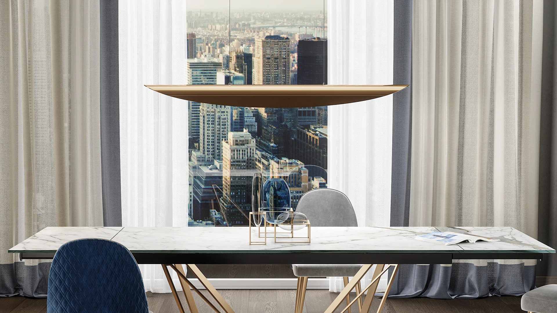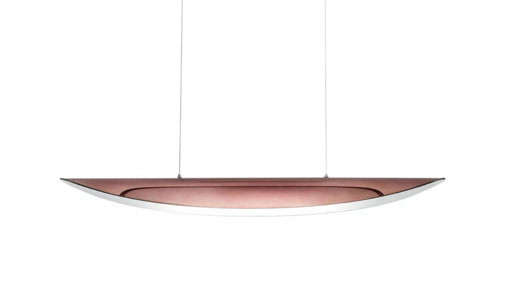Závesné svietidlo zo zakriveného kovu, vnútorne lakované vo farbe latte. Vonkajšia povrchová úprava naprašovaním v bronze, medi alebo striebre.