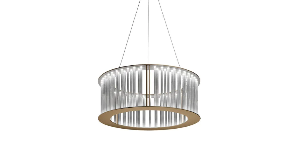Závesné svietidlo s kovovou konštrukciou v prevedení saténovej mosadze alebo titánu a pevnými priehľadnými sklenenými prvkami. Stropná podpera v zrkadlovom skle a LED systéme.