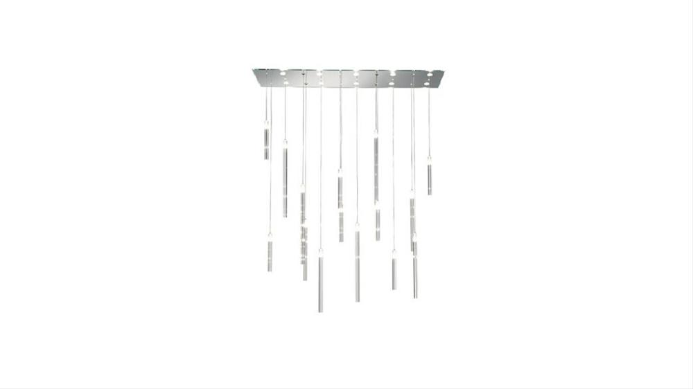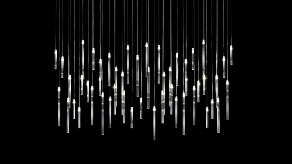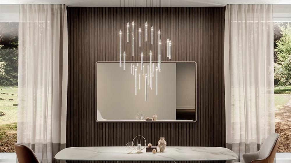 Svietidlo so stropnou doskou zo zrkadlového skla so zabudovanou LED. Závesné prvky z pevného priehľadného skla s LED. Je možné realizovať prispôsobené verzie pre rozmery, dĺžku a tvar.