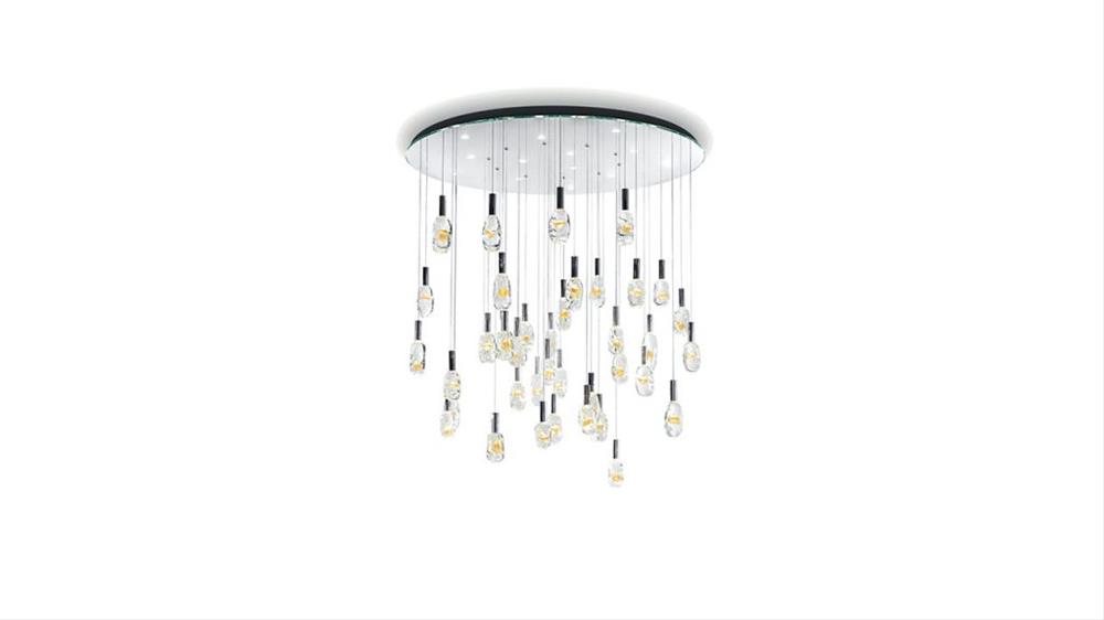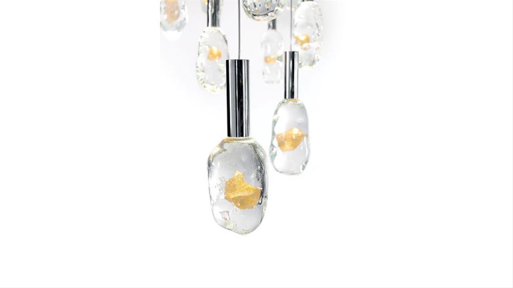Luster s podperou zrkadlového skla so zabudovanou LED diódou so závesnými kameňmi z pevného priehľadného a zlatého skla Murano s LED vo vnútri. Jeho konštrukcia umožňuje realizovať prispôsobené verzie pre rozmery, dĺžku a počet prvkov.