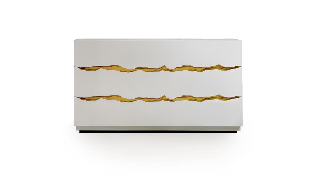 Komoda z lesklého bieleho alebo čierneho lakovaného dreva beluga s dekoráciou medzi zásuvkami zo saténovej mosadze alebo zlata.