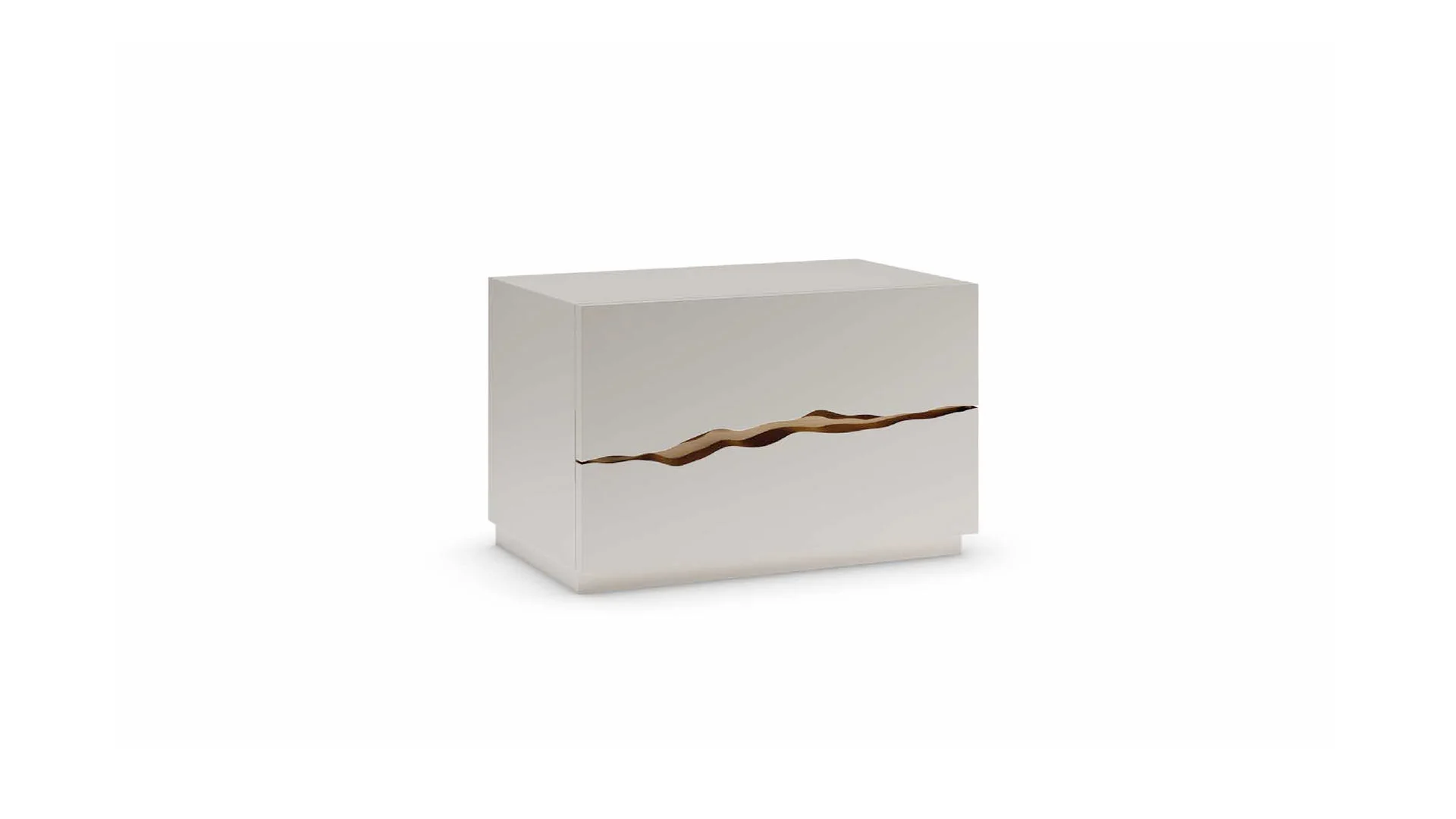 Nočné stolíky v lesklom lakovanom prevedení vo farbe latte alebo nero beluga. Dekorácia medzi 2 zásuvkami v zlatej alebo mosadznej úprave.