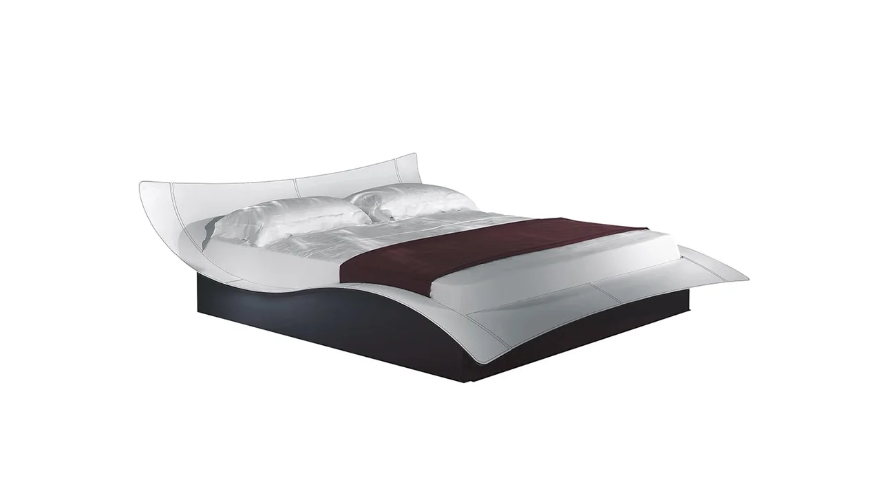 Tvarovaná posteľ potiahnutá kožou s drevenou podnožou v matnom lakovanom prevedení.