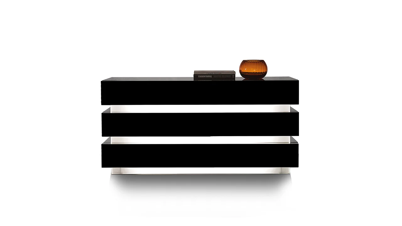 Komoda z dreva s deliacimi časťami z extra číreho leptaného a tvrdeného skla s vnútorným LED osvetlením. Vrch z lakovaného skla pre lakovanú verziu.